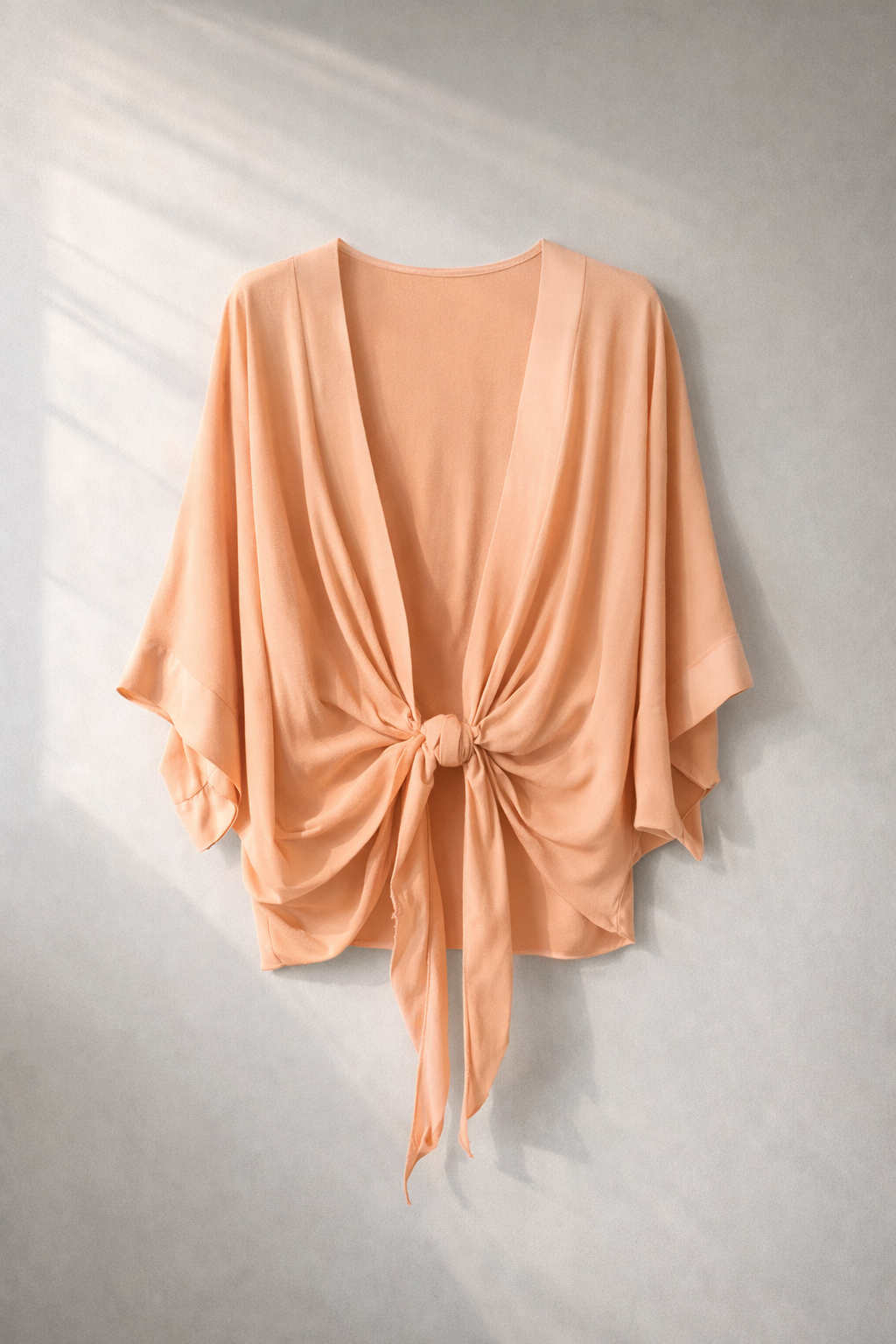 Un kimono muy versátil, con su diseño drapeado y el nudo frontal, es la prenda perfecta para añadir un toque bohemio y sofisticado a cualquier conjunto. Ideal tanto para llevar sobre un vestido en una noche de verano como para dar un aire relajado a un look de día con vaqueros.