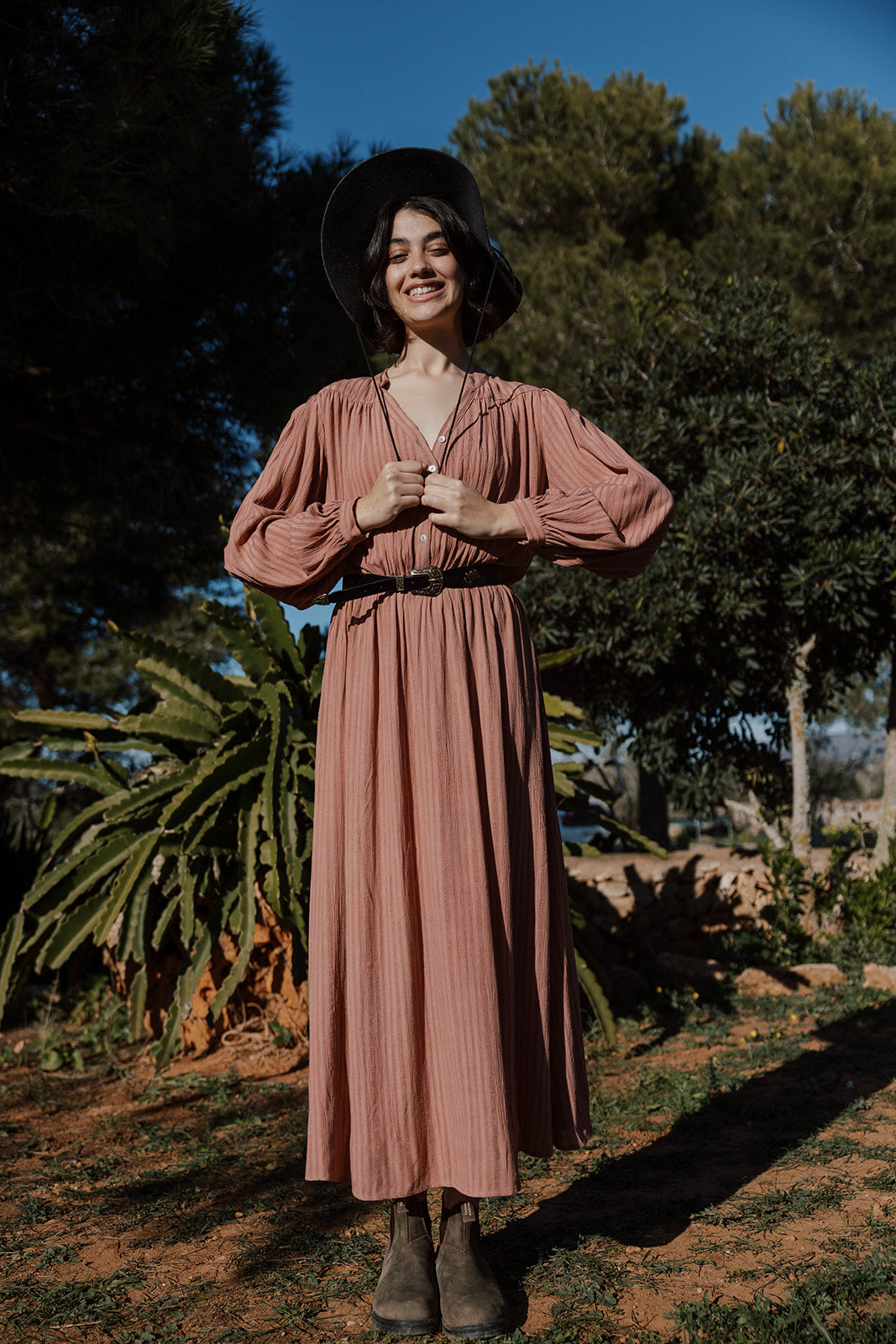 JUNAINA is a romantic and minimalist dress crafted from viscose jacquard, making it comfortable and skin-friendly—a marvel. Its shirt-style cut, slightly puffed sleeves with elastic at the cuffs, and covered buttons make it a very feminine piece that's easy to wear on any occasion.