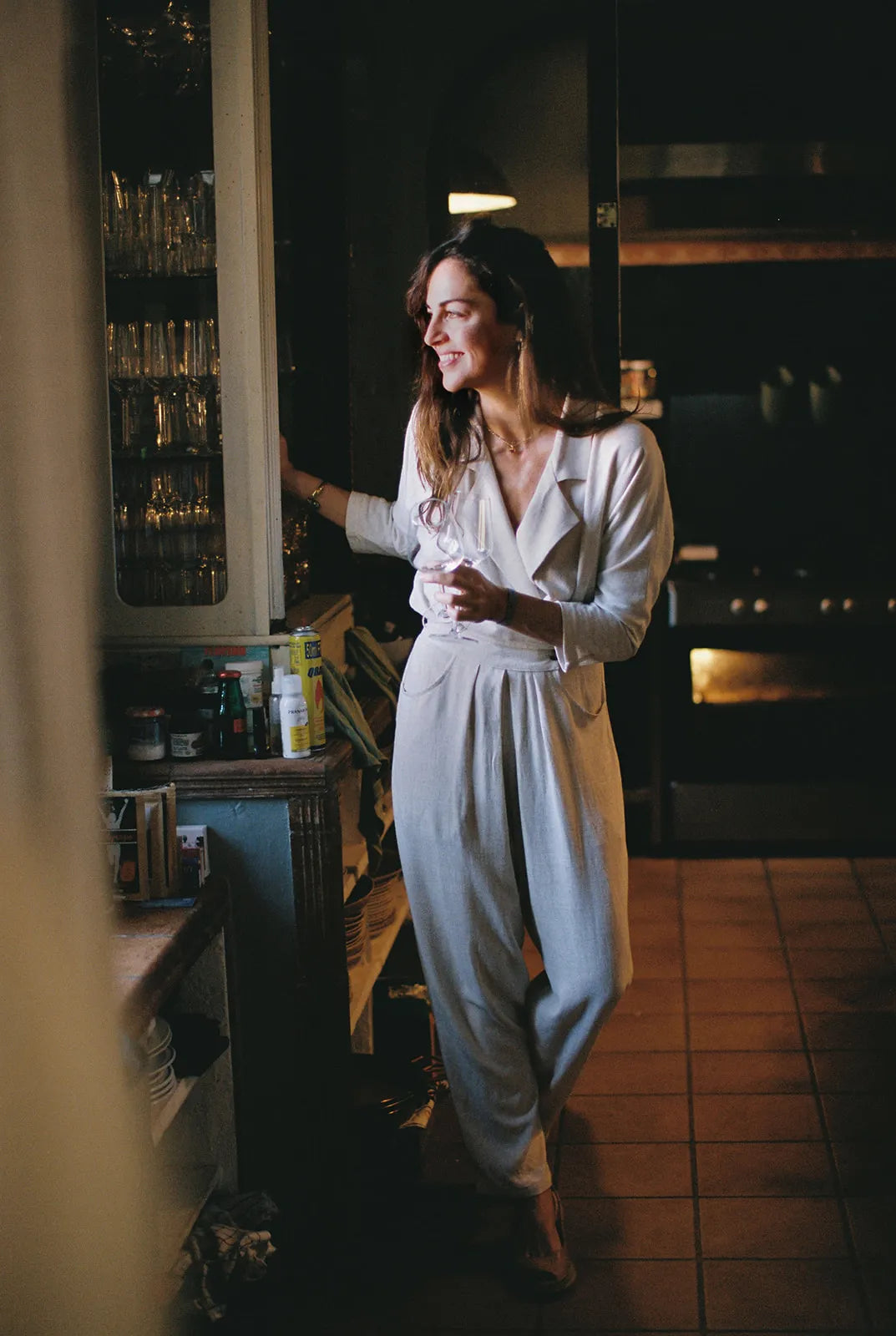 SANDRA is a beautiful and sophisticated safari-style jumpsuit with an elastic waist, a low neckline, and long sleeves. Perfect for any occasion.