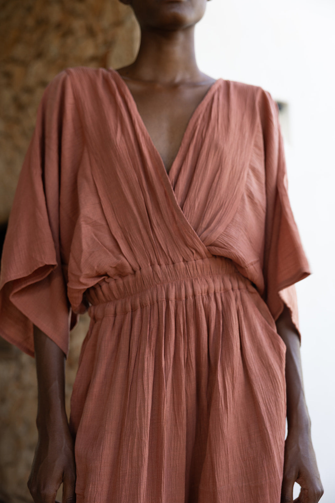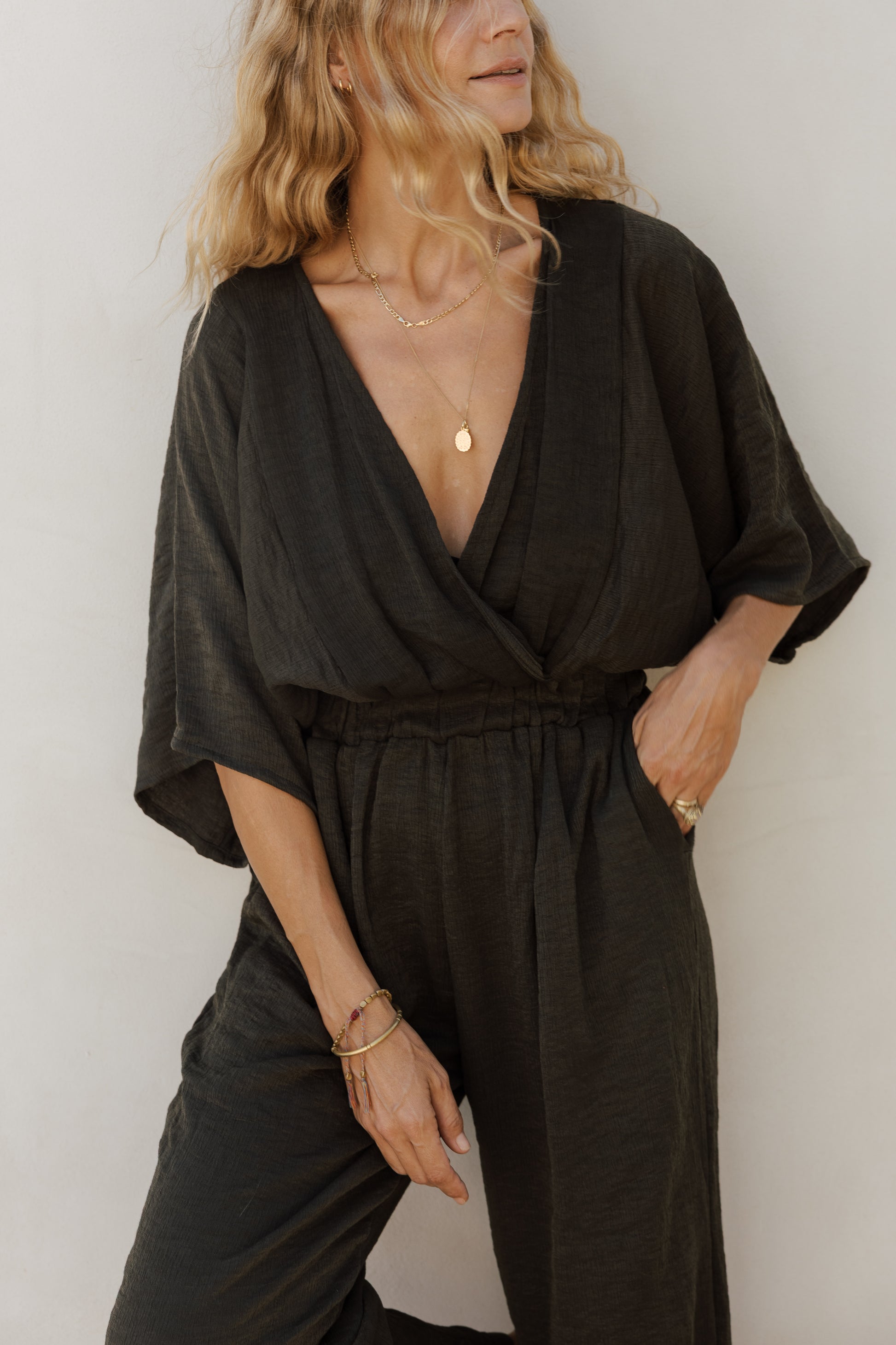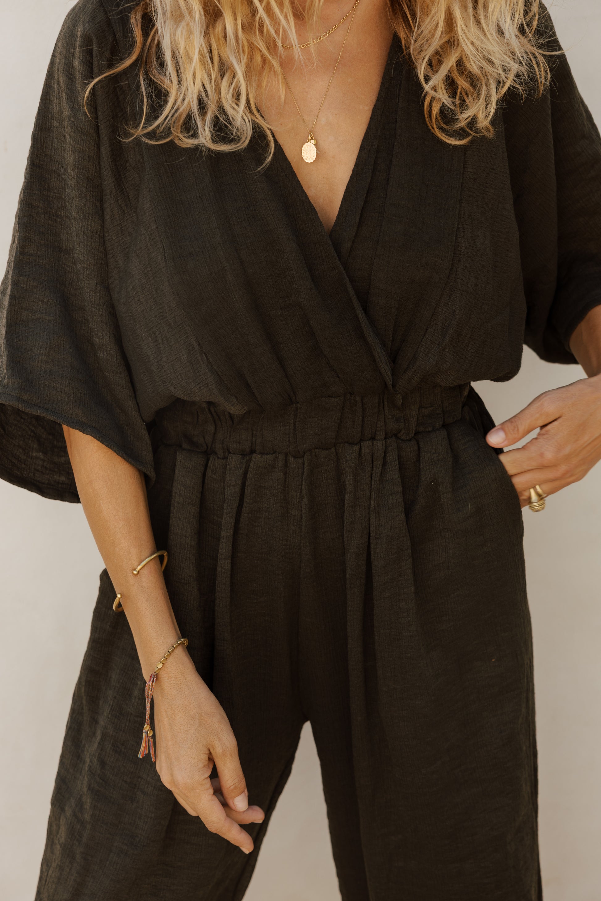 SALLY is an elegant and relaxed jumpsuit with a crossover neckline and oriental-inspired dropped sleeves. Its elastic waistband provides comfort without sacrificing structure, creating a fluid and flattering silhouette. It's an ideal garment for achieving a sophisticated look with complete freedom of movement, perfect for day or night.