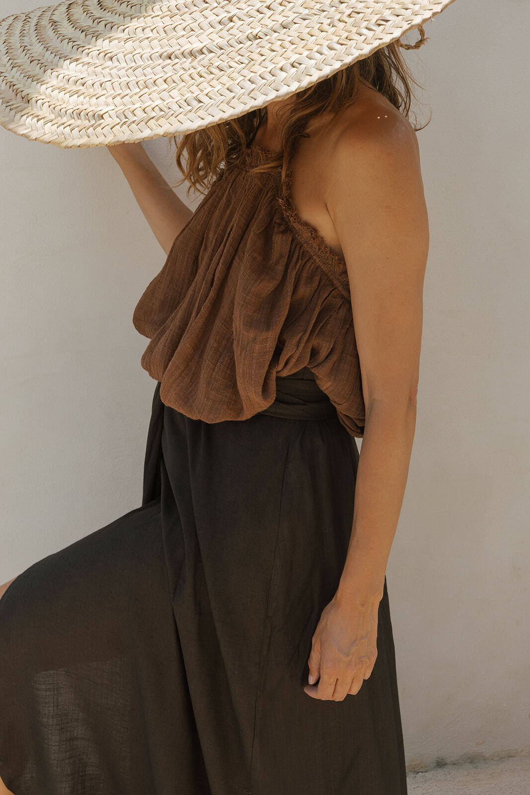 TIANA is a halterneck top crafted from a lightweight, airy fabric. A garment with movement and character, ideal for creating sophisticated looks on summer evenings or elevating your daytime looks during the summer season.