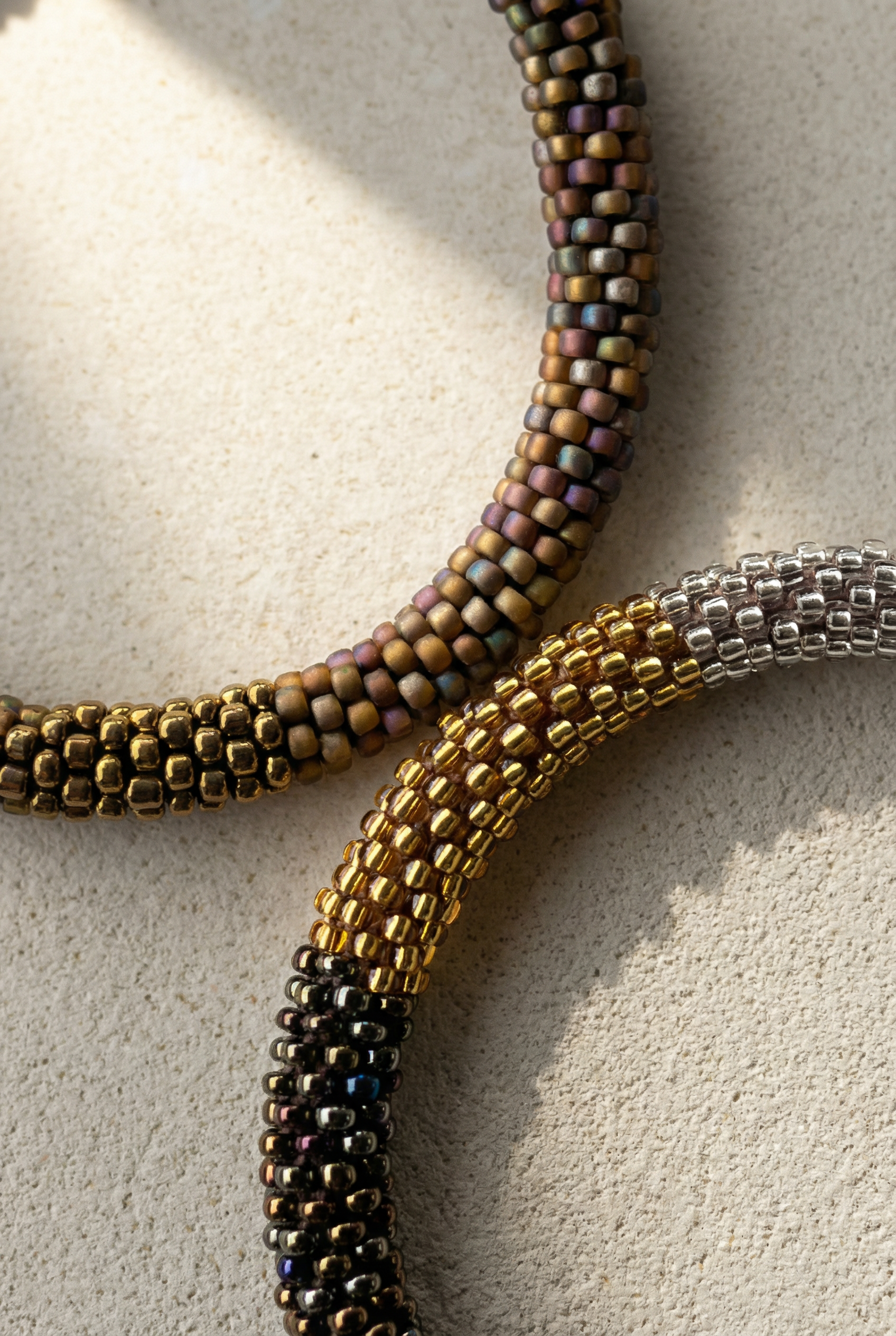 Están hechas con cuentas de vidrio de alta calidad tejidas a ganchillo sobre un resistente hilo de algodón, lo que las hace flexibles y adaptables a todas las muñecas.