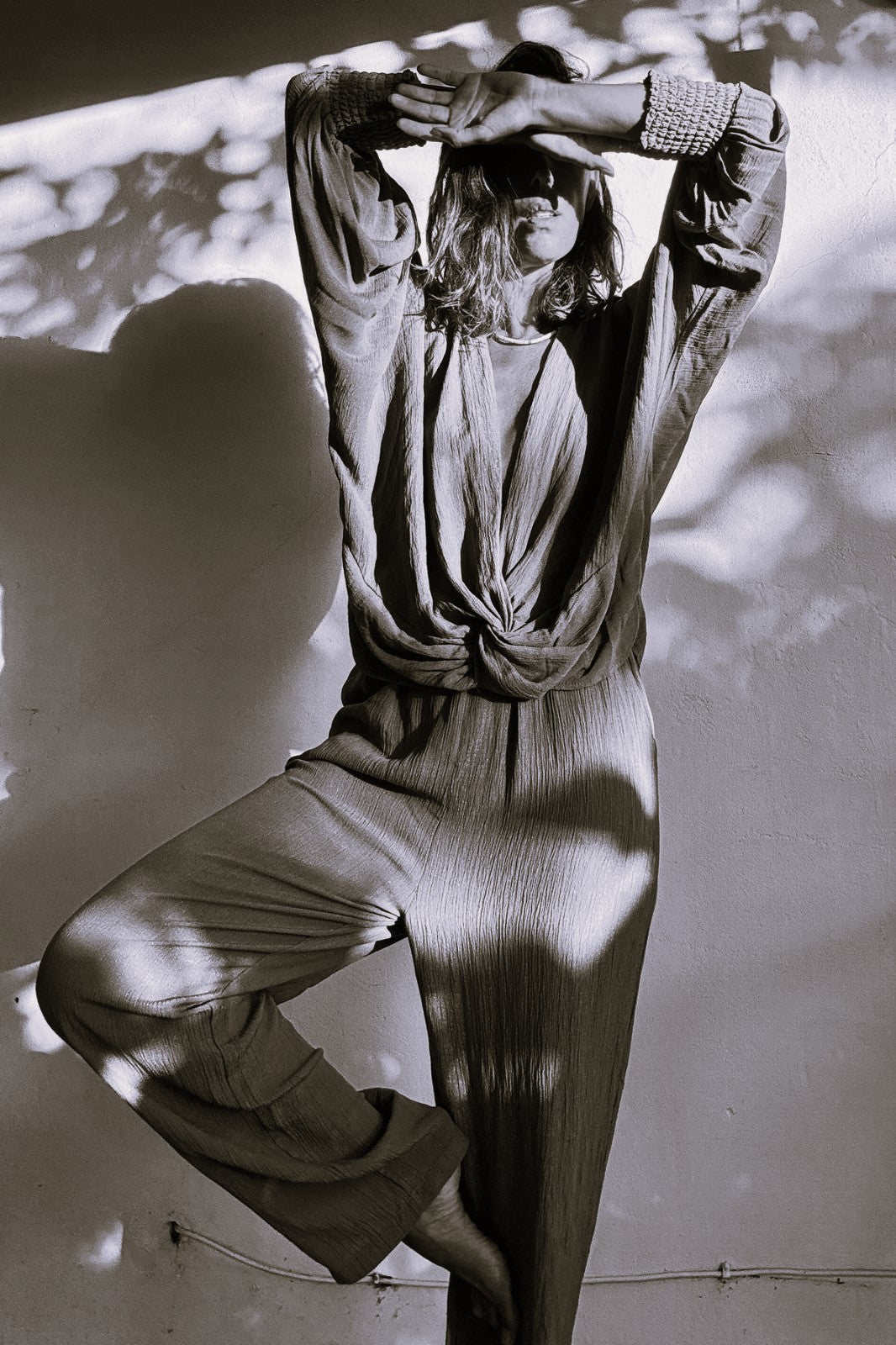The LINDA blouse, with its elegant drape, center knot, and batwing sleeves, is paired with the relaxed, low-rise Evangeline pants to create a look designed for freedom and presence. The subtly sheeny fabric lends a refined air, while the relaxed structure makes it a perfect companion for any time of day. A BLUSH shade that exudes softness and freshness, perfect for a subtle yet distinctive style.