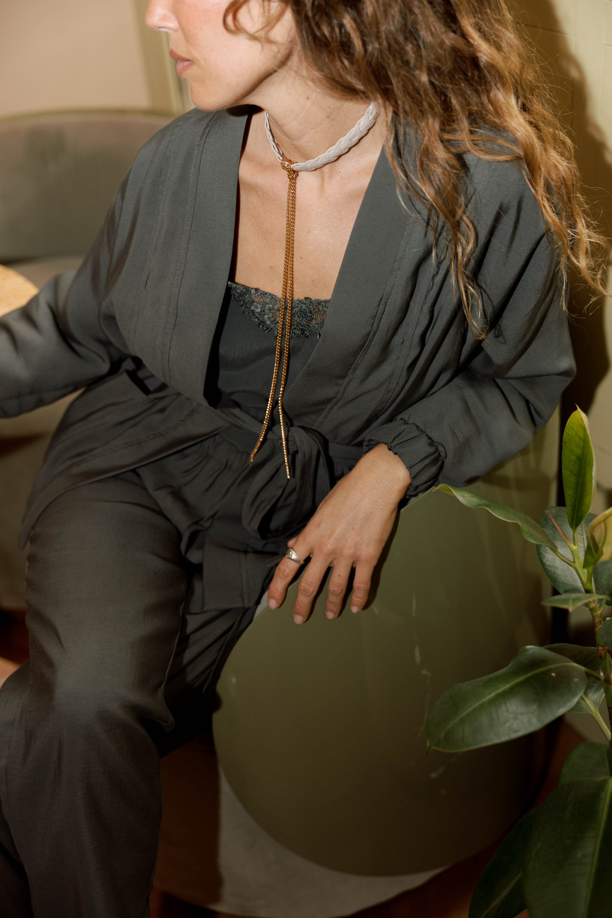 COTI es un kimono de líneas puras y actitud relajada. Su cinturón define la figura sin esfuerzo y los bolsillos amplios evocan calma y funcionalidad. Una prenda pensada para moverse contigo, sin perder estilo.