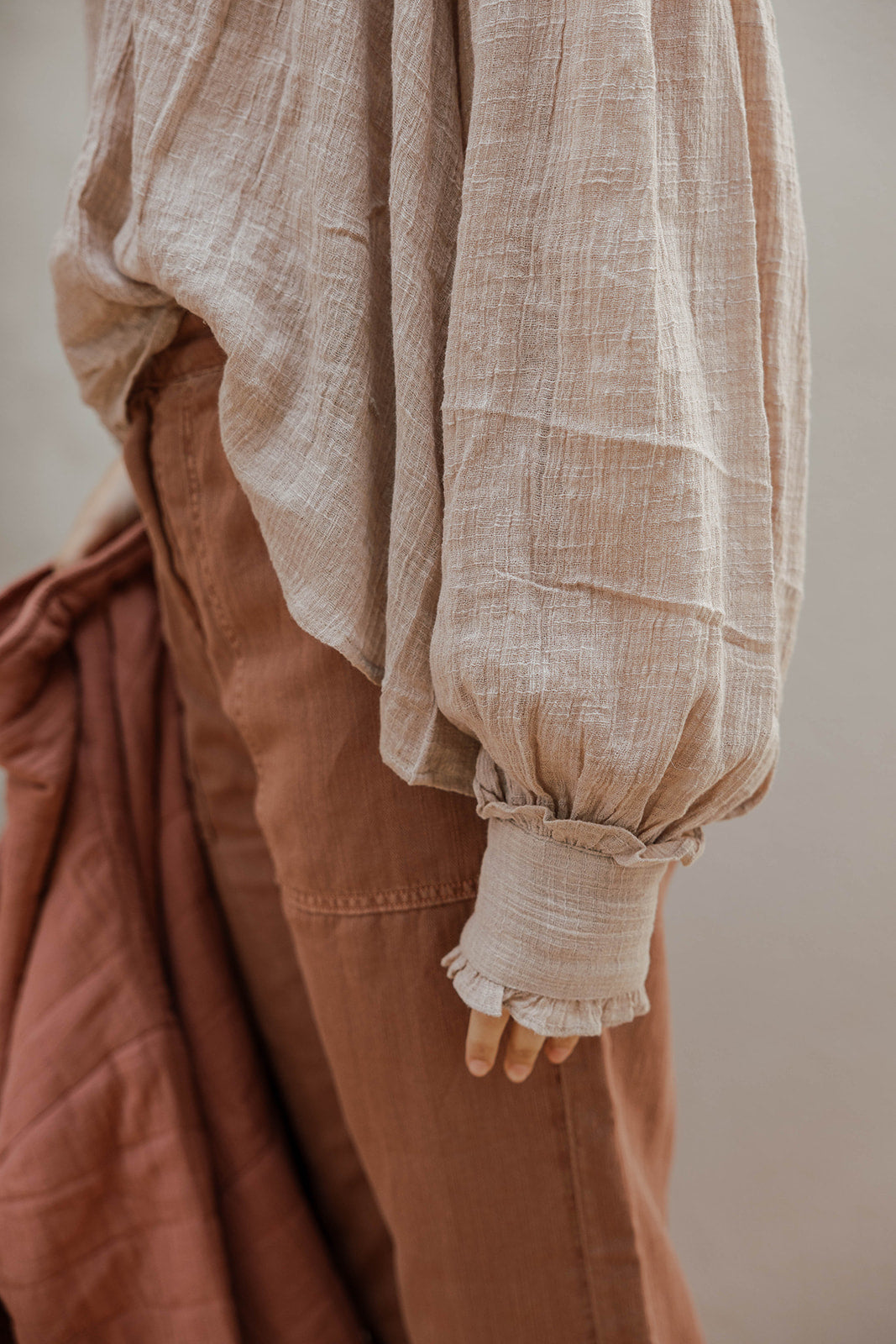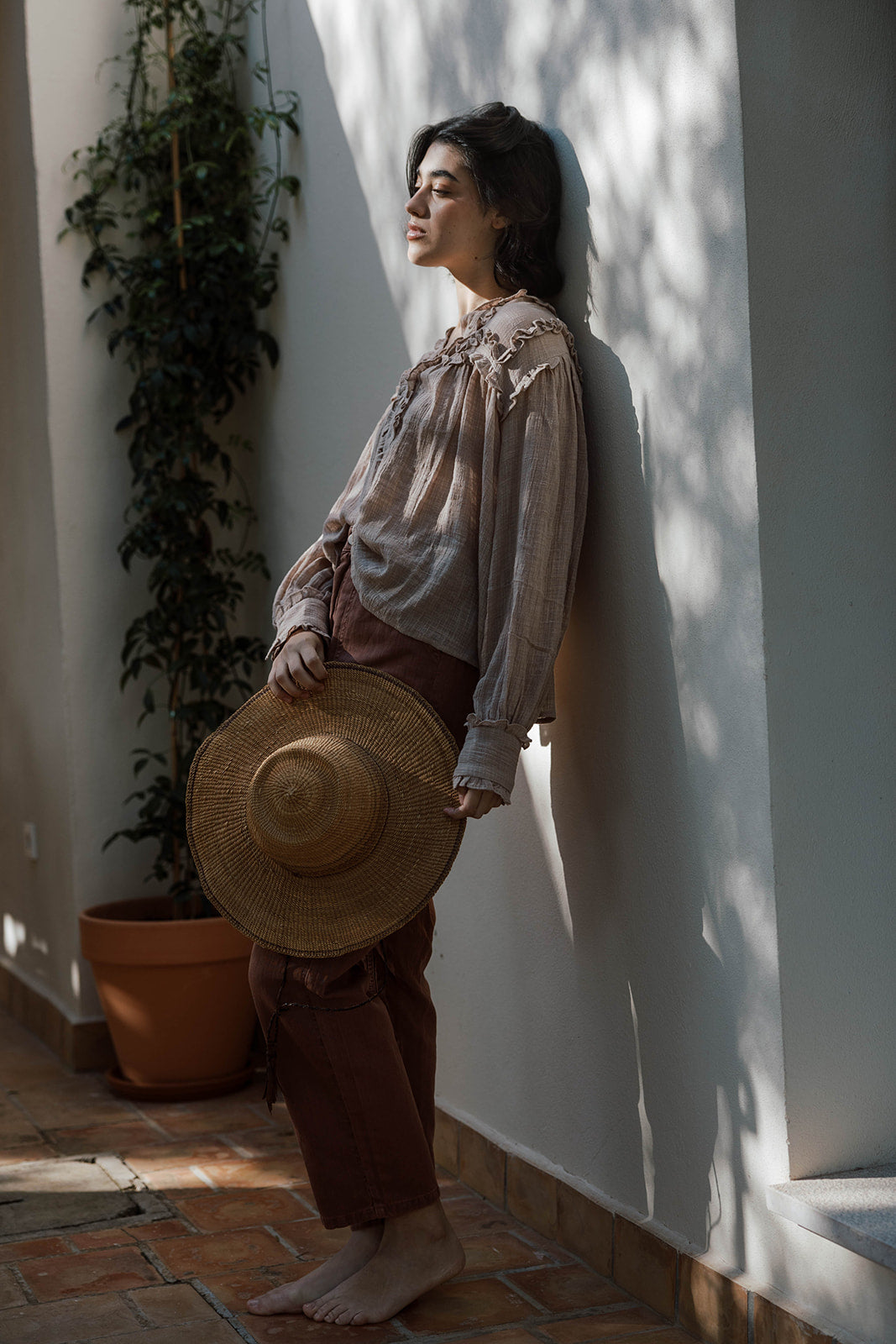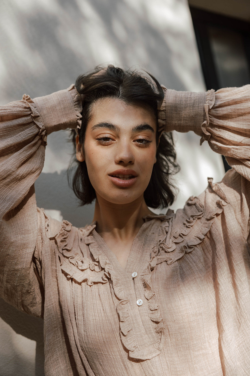La blusa BELLA tiene un estilo muy femenino y romántico confeccionada en una gasa de algodón que la hace súper cómoda sobre la piel. Tiene un corte recto, escote y hombros con pequeños volantes y un puño muy especial que se puede abrir con dos botones.