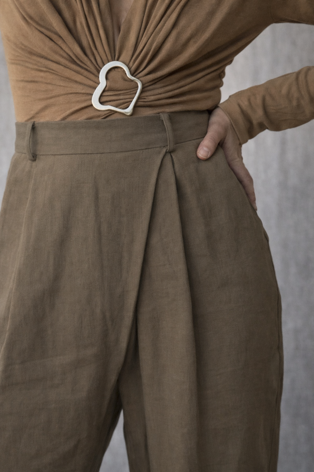 Eleva tu propuesta de estilo con el PAM body CAMEL, una pieza de diseño escultural con un sofisticado detalle metálico orgánico, combinándolo con nuestro pantalón COCO en tono MARRÓN. Este conjunto funde la sensualidad del drapeado frontal con la estructura relajada de una silueta sartorial, creando un look monocromático y atemporal que personifica la elegancia natural y el espíritu artesanal de Ten Twelve.