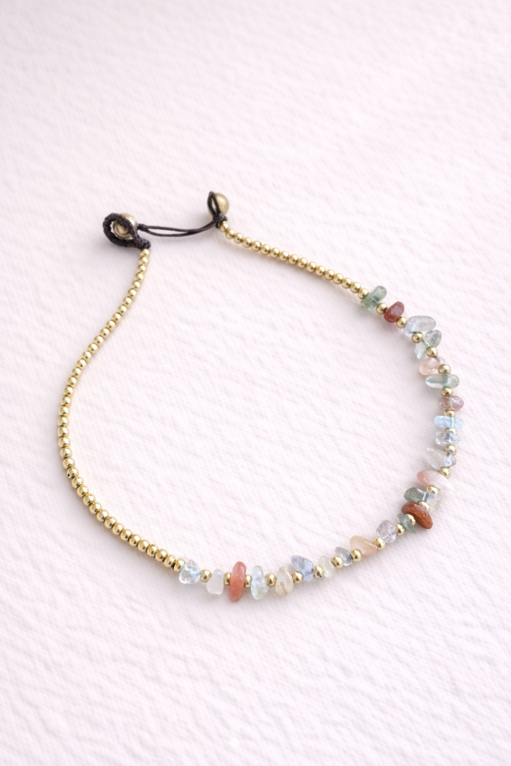 Una delicada TOBILLERA de inspiración natural una armoniosa gama de colores coral y visones. Su diseño orgánico, con pequeñas piezas irregulares, crea un efecto luminoso y sutil sobre la piel. Cada tobillera es única, con variaciones naturales en las piedras que hacen de cada pieza algo irrepetible.