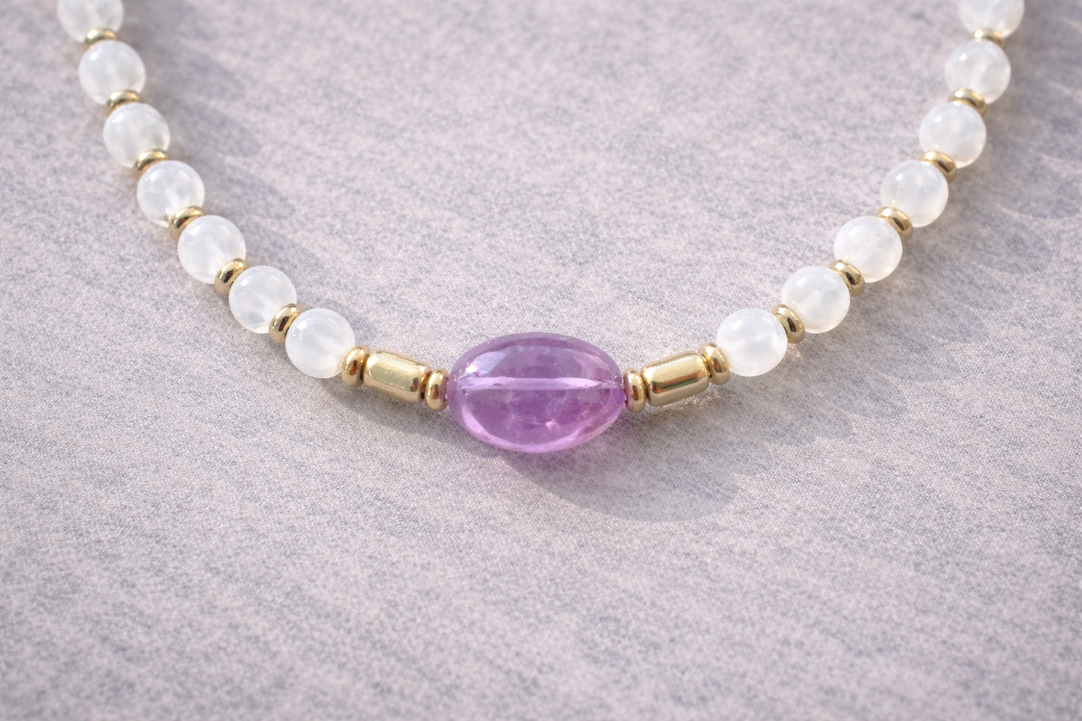 Collar fino con pequeñas piedras blancas y una piedra central. La encontramos en color gris o violeta. Las cuentas blancas aportan luz y suavidad, mientras que la piedra central introduce un contraste más profundo y natural. Es una pieza equilibrada, discreta y fácil de combinar. Ligero y cómodo, pensado para el día a día o para llevar con otras piezas. Se ajusta fácilmente gracias a su cierre con cadena.