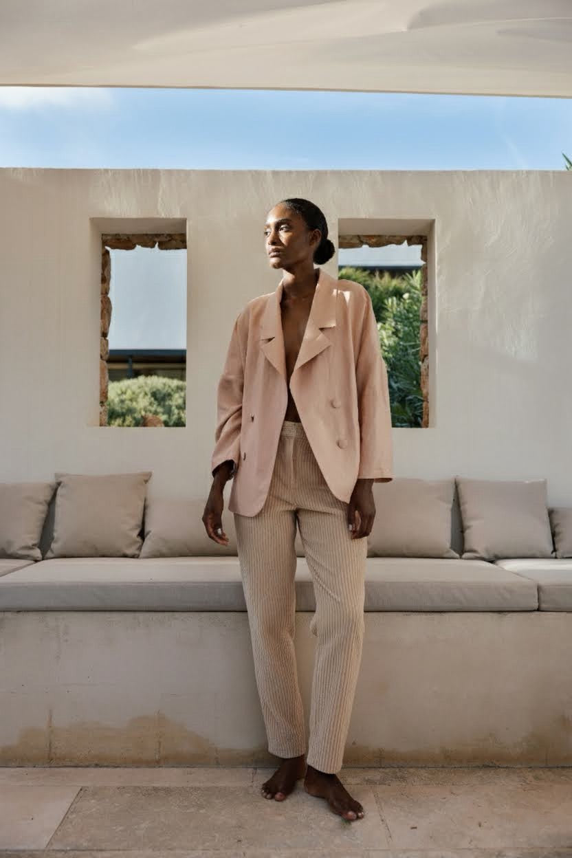 El conjunto LUCA AMERICANA NUDE y MÓNICA PANTALÓN NUDE representa la sintonía perfecta entre la sastrería clásica y la feminidad contemporánea. Con un tono que celebra la luz y la atemporalidad, este traje de dos piezas destaca por su silueta impecable y una caída que acompaña cada movimiento con elegancia y naturalidad.