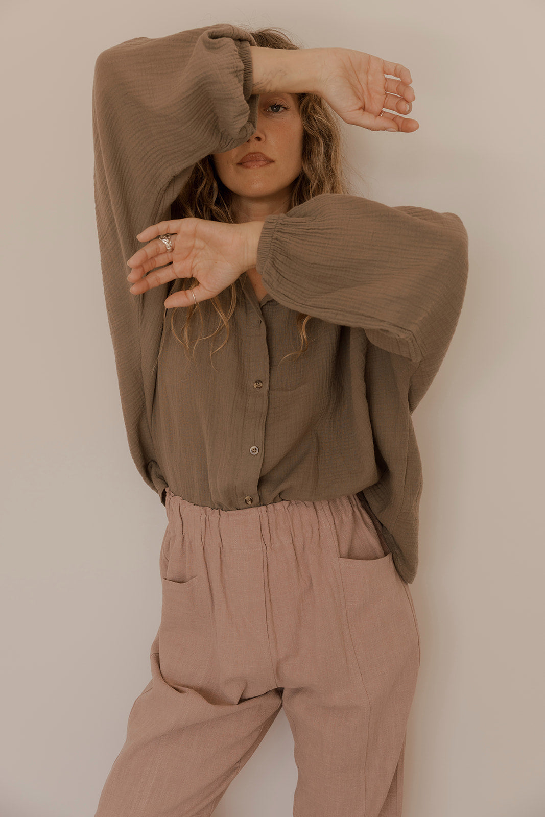 Amplia, ligera, con caída suave y botones que no apuran. El cuello abierto y las mangas generosas invitan al movimiento lento, al gesto despreocupado. El tono tierra y la textura sutil la convierten en una pieza que acompaña sin exigir, como quien está presente sin hacer ruido.