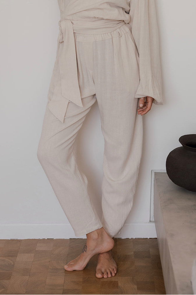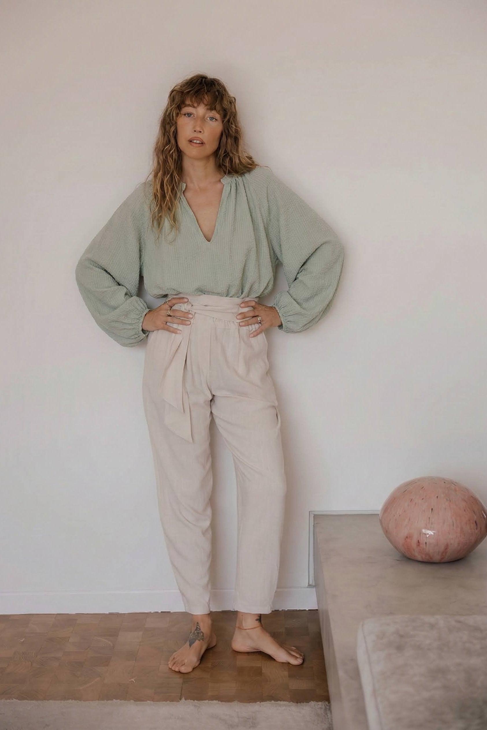 El conjunto formado por la NOLITA BLUSA VERDE y el SIMONE PANTALÓN ECRU es una invitación a la delicadeza y al romanticismo contemporáneo. La armonía entre los dos matices de rosa crea un juego visual de profundidades sutiles, donde la ligereza de la blusa con sus mangas abullonadas se equilibra con la estructura fluida y el detalle del lazo en la cintura del pantalón.