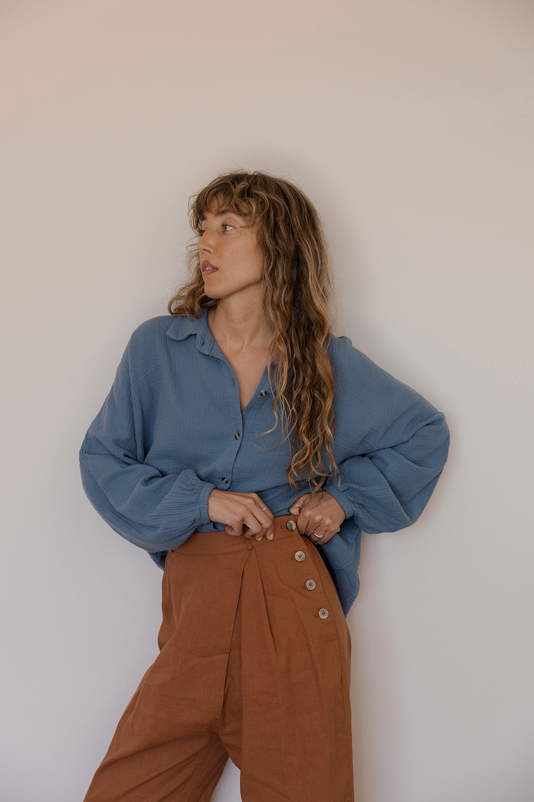 El pantalón LAUREN tiene un cruce delantero, cierre de botones laterales y goma en la espalda para ajustarse perfectamente a tu cintura. Perfecta para un look casual pero con mucho glamour. Tiene un bonito y sofisticado diseño sobre un suave y fresco tejido de lino/viscosa en color natural. Es una prenda genial para llevar tanto de día como de noche y hace un total look perfecto con todas tus blusas.
