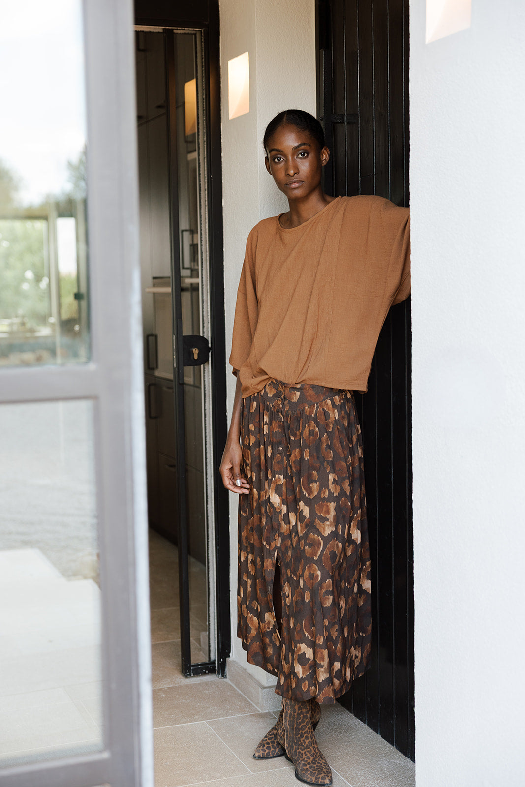 AMONA es una falda midi confeccionada en 100% viscosa con un favorecedor estampado animal print en tonos cálidos. De silueta fluida y con una caída suave, presenta un diseño abotonado en el delantero con botones forrados que aportan un acabado delicado y sofisticado. La cinturilla combina estructura y confort: parte delantera plana y espalda con elástico, lo que asegura un ajuste cómodo y favorecedor. Ideal para combinar con blusas ligeras o camisetas básicas, AMONA es una pieza versátil que funciona tanto para un look relajado de día como para ocasiones más especiales.