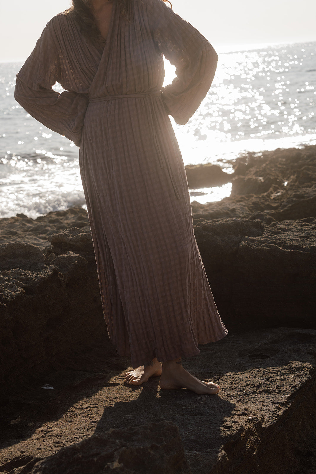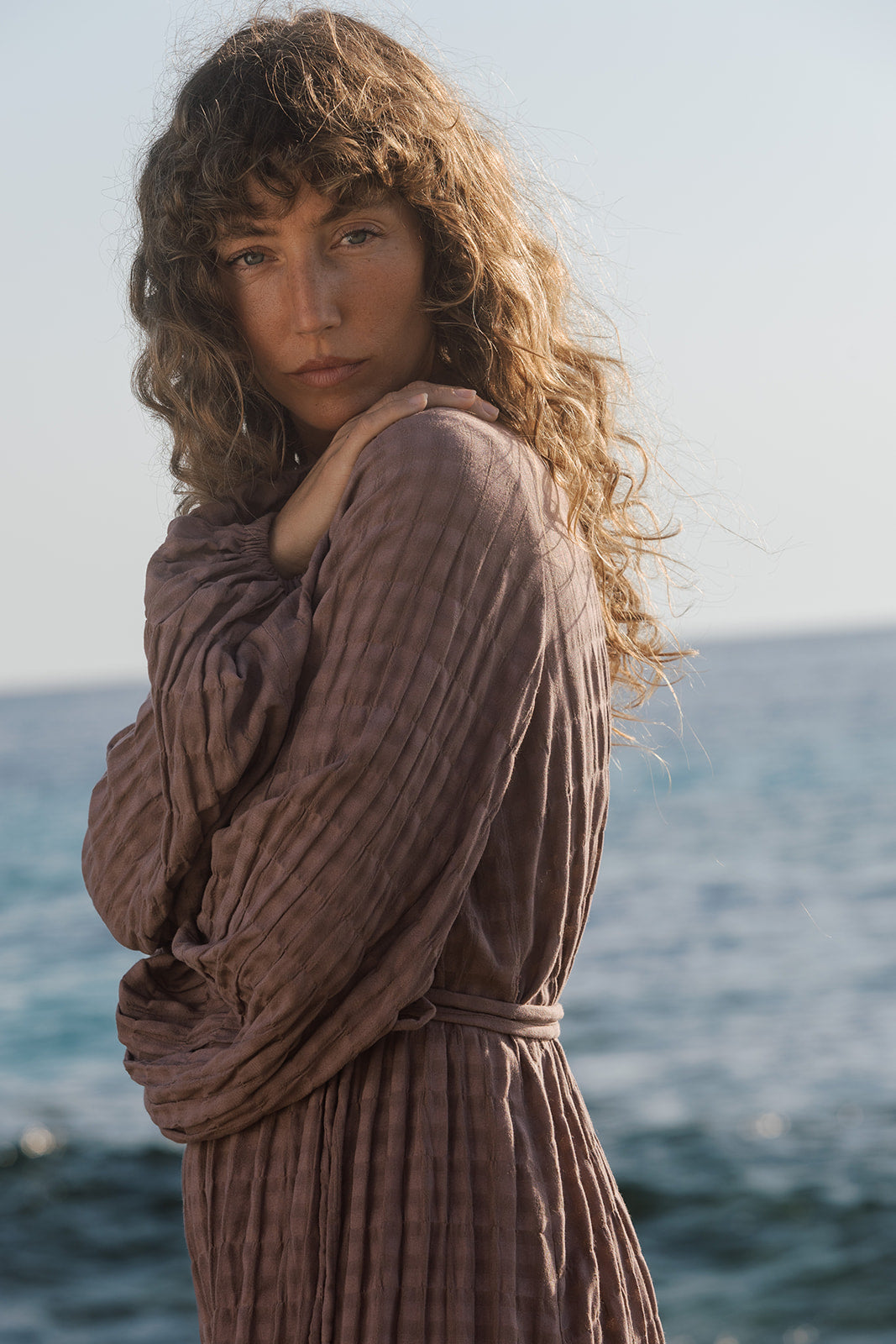 El vestido ANAE es una prenda versátil y femenina confeccionada en cómodo jacquard de algodón. Sus mangas abullonadas cuentan con puños elásticos y un detalle de volantes para darle un toque romántico, mientras que el efecto envolvente te permite llevarlo como vestido o incluso como un kimono largo minimalista sobre camisas, tops o vestidos de tirantes.