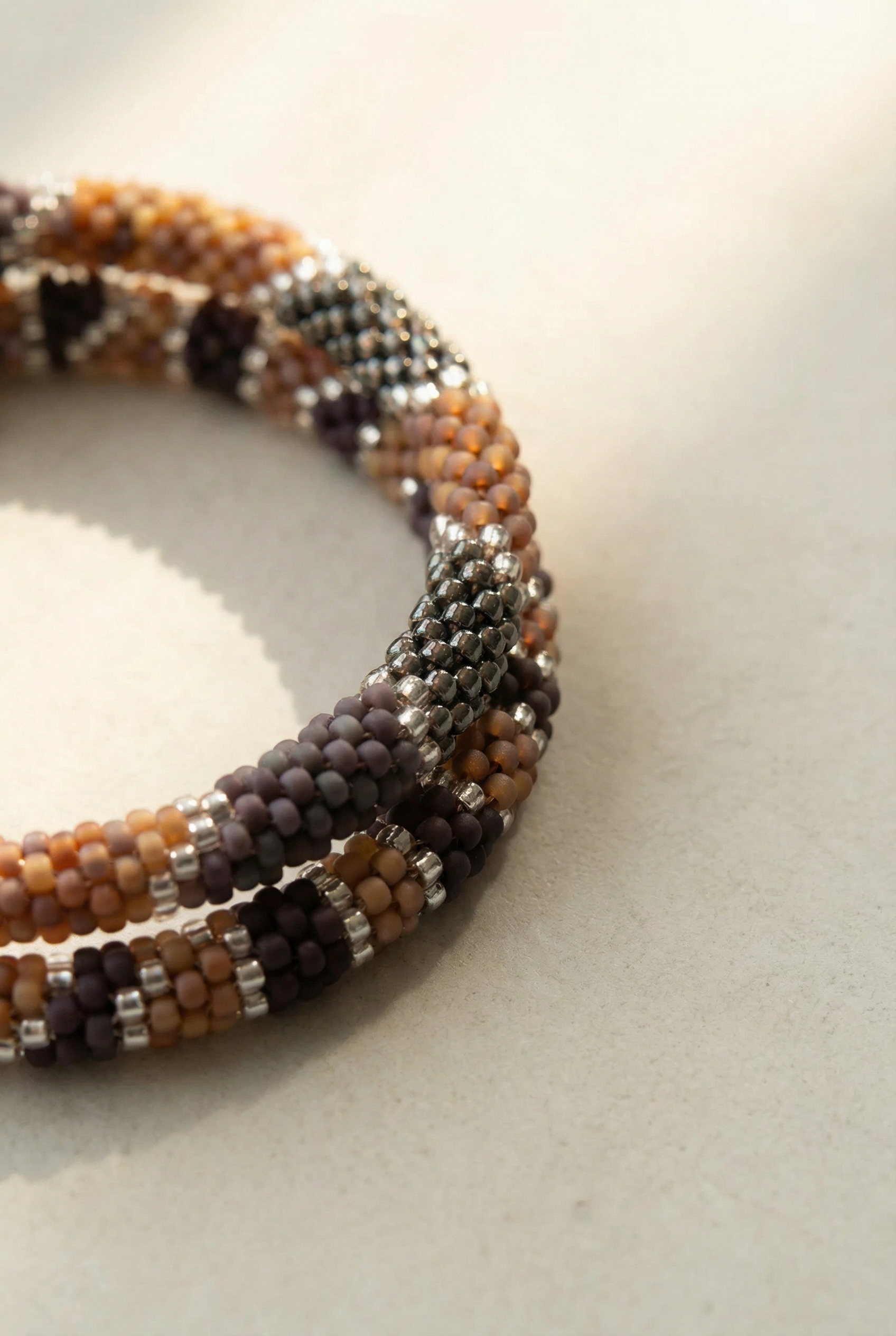 Las pulseras están fabricadas a mano meticulosamente por artesanas en Nepal.