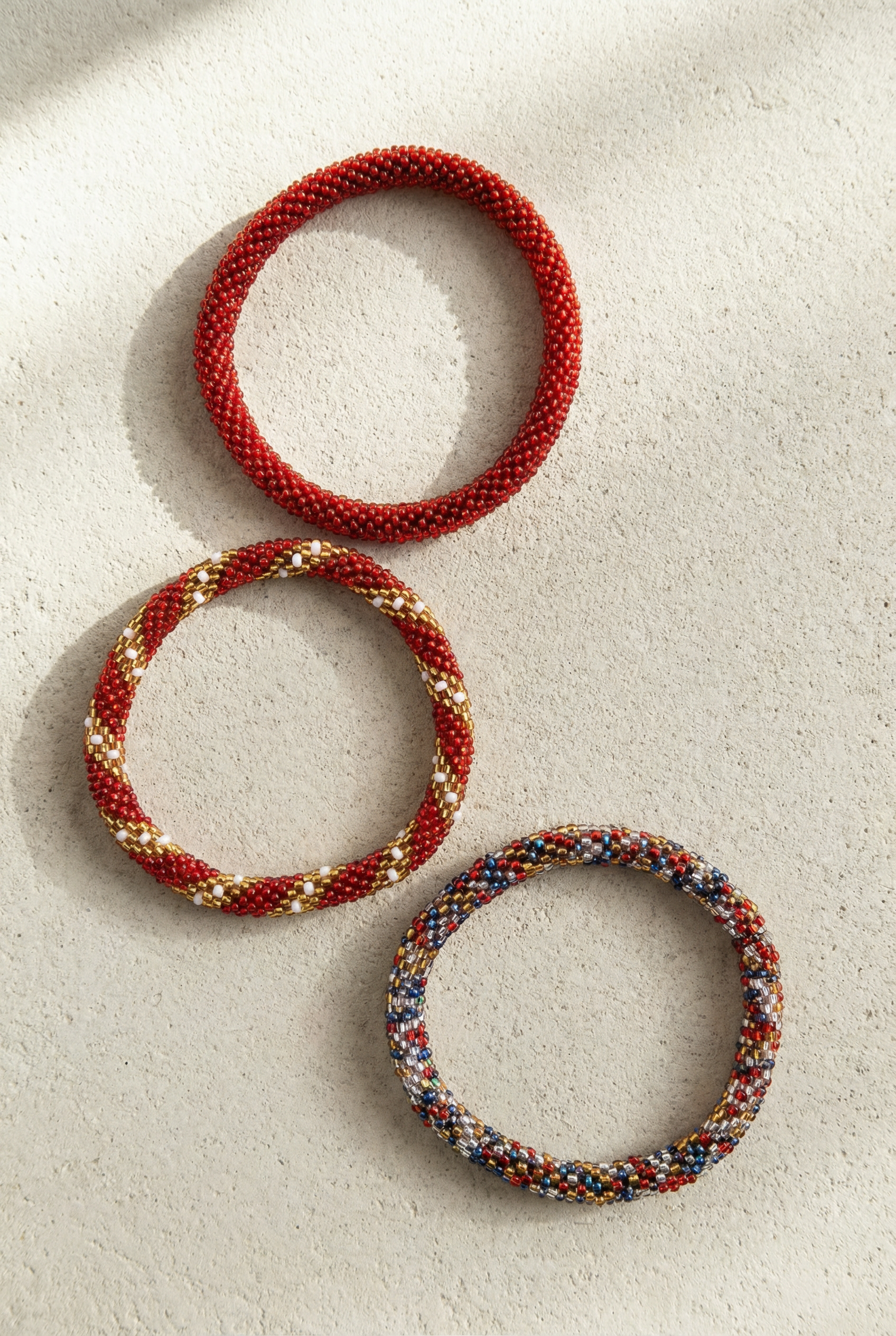 Las pulseras están fabricadas a mano meticulosamente por artesanas en Nepal. Están hechas con cuentas de vidrio de alta calidad tejidas a ganchillo sobre un resistente hilo de algodón, lo que las hace flexibles y adaptables a todas las muñecas. Puede haber diferencias de una pulsera a otra; la tensión y la regularidad de las perlas pueden ser distintas. Estos pequeños matices refuerzan su singularidad.
