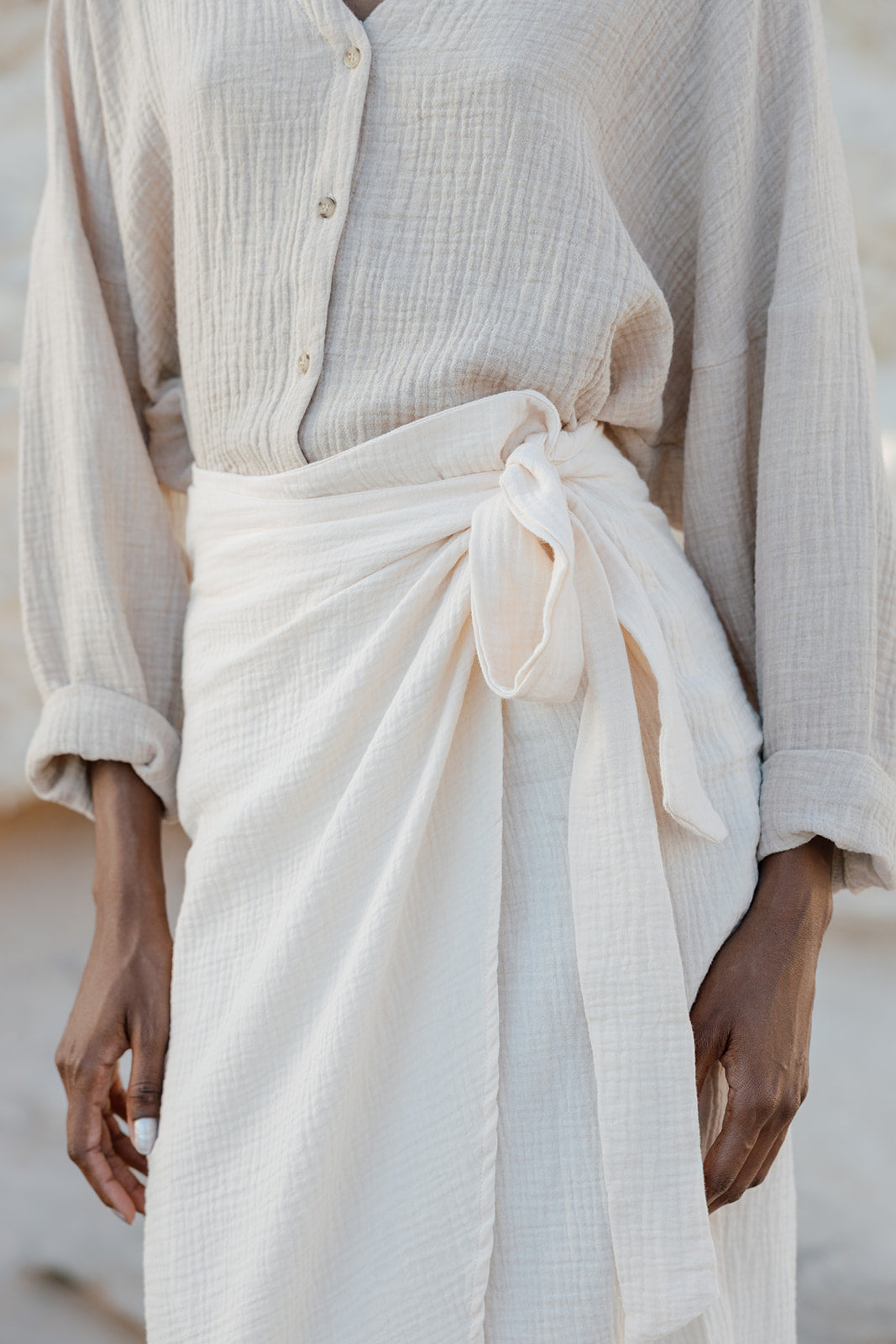 MARIA RUSTIC es una falda confeccionada en algodón rústico, de diseño minimalista que simula un pareo.