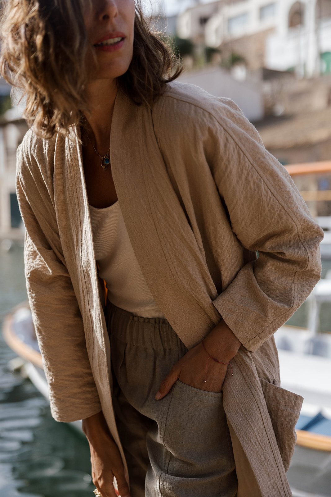 PILAR es una chaqueta de lino de algodón de corte oriental, cinturón del mismo tipo y bolsillos de parche. El efecto lavado de su tejido italiano le aporta un estilo casual.