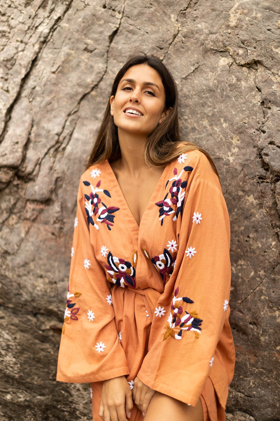SALMA es un kimono largo con base de algodón rústico decorado con un bordado a mano espectacular. Es una joya en forma de abrigo pero que también se puede utilizar como vestido cruzado utilizando el cinturón. Se trata de un tejido bordado a mano por artesanas Indias.