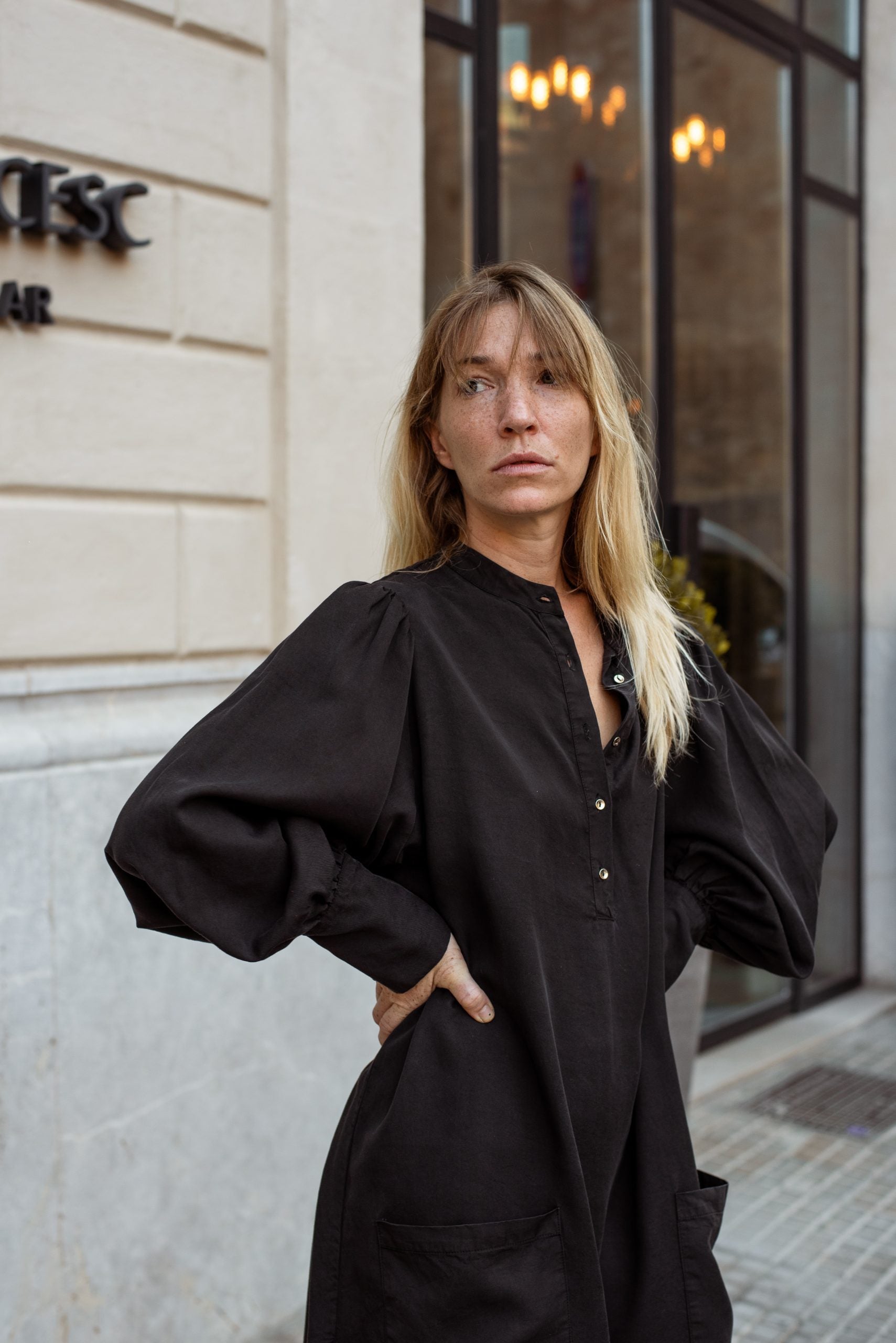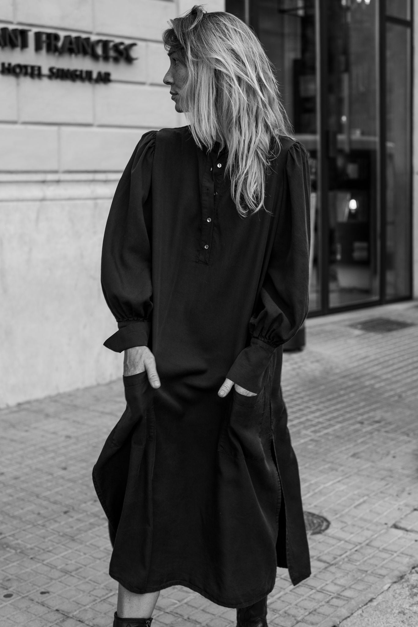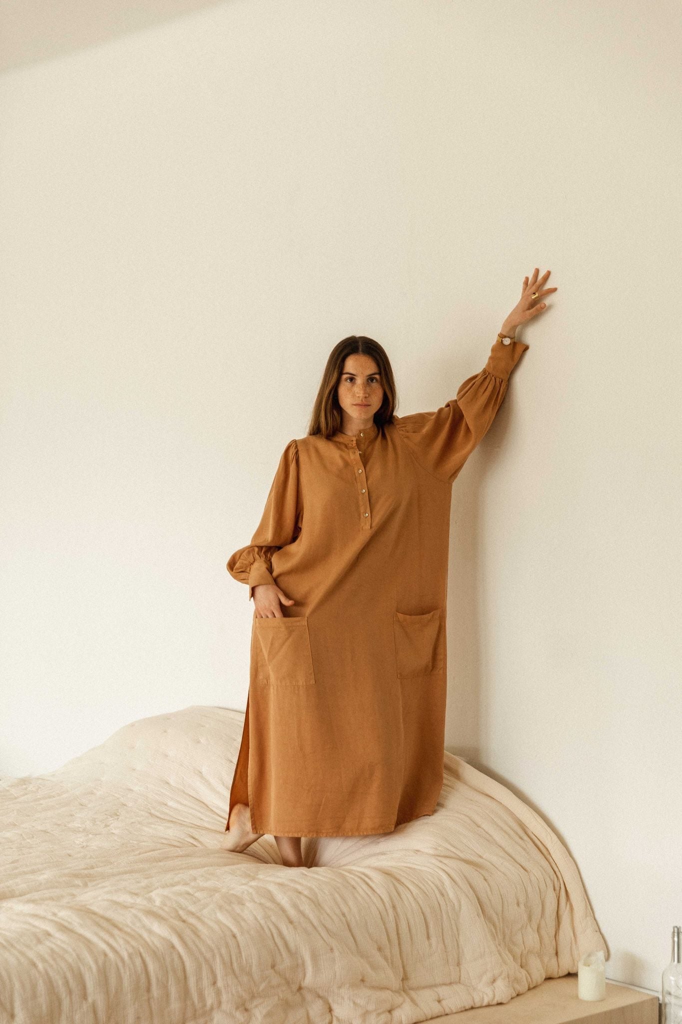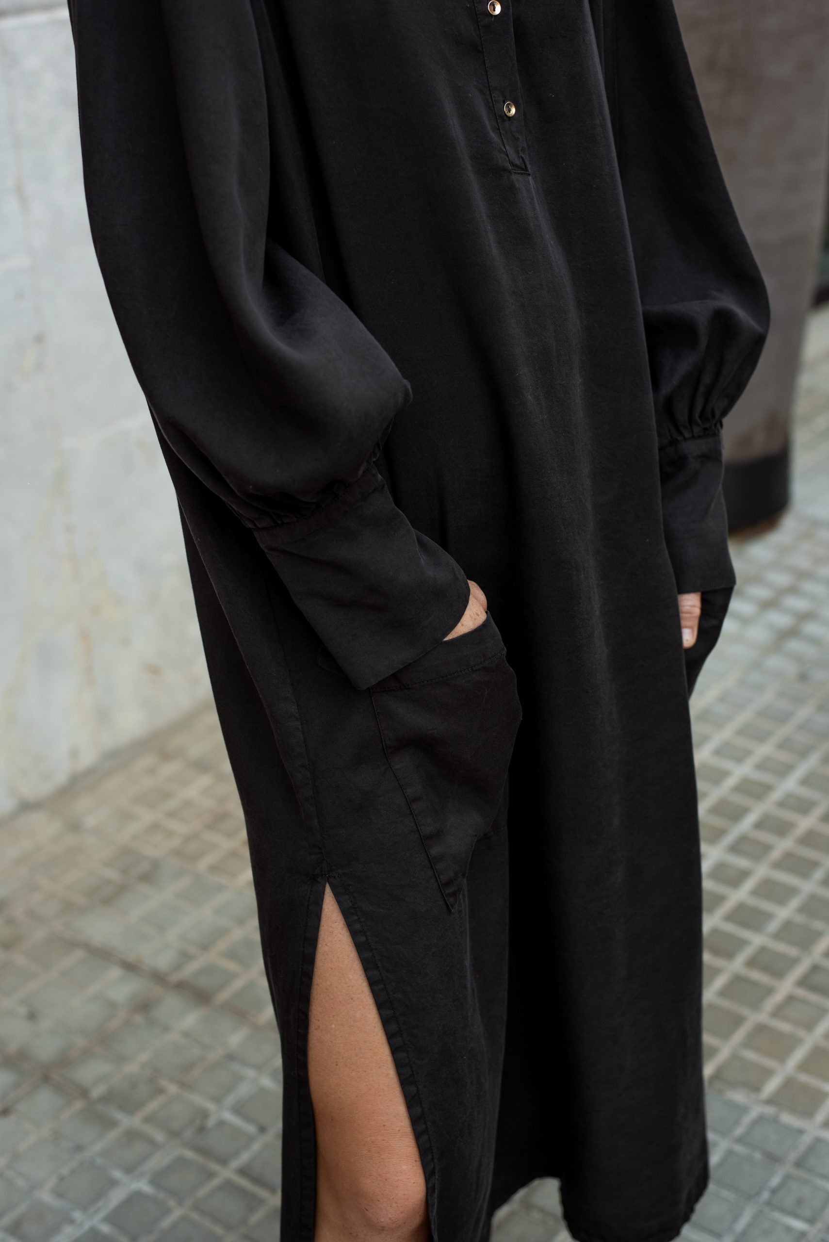 ANGELA es un vestido 100% tencel con bolsillos en frente y botones en el escote. Un vestido camisero amplio de largo midi, con mucho volumen y movimiento. Una pieza atemporal para atesorar para siempre.