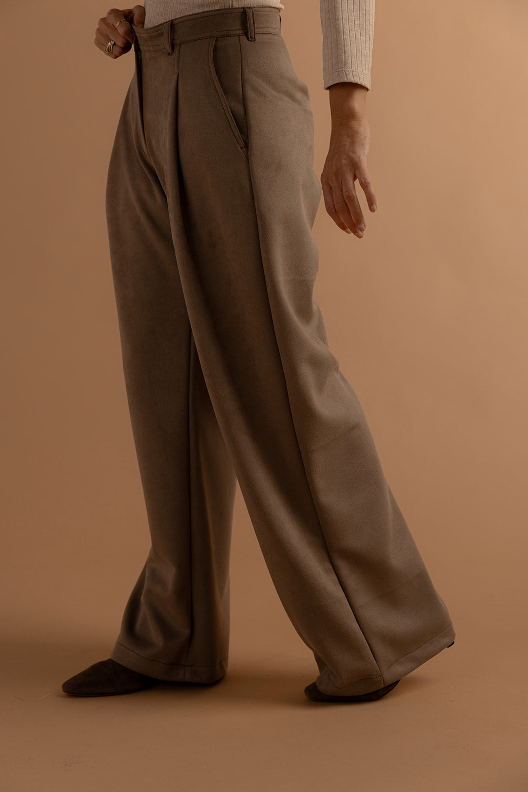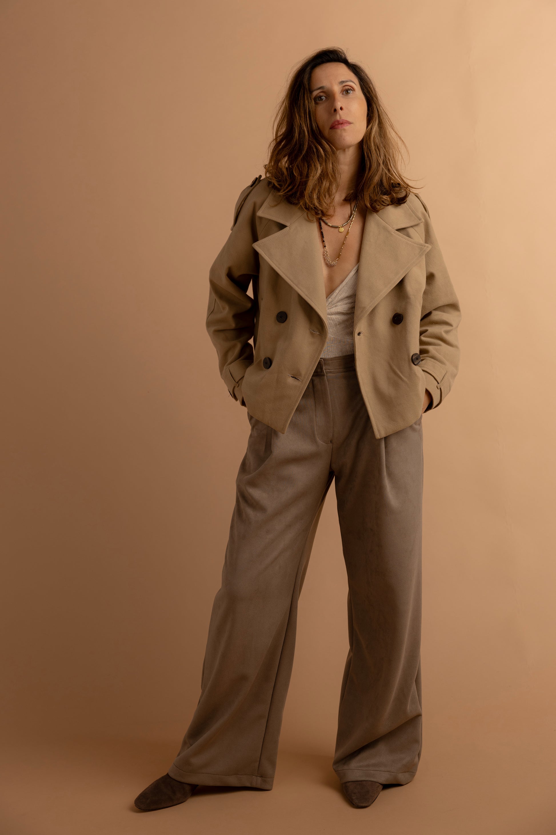De corte clásico y líneas limpias, esta pieza se posa con elegancia discreta. Los pliegues frontales dibujan una silueta serena, mientras el tono tierra aporta calidez sin estridencias. Se lleva con naturalidad, como quien no necesita más que lo esencial.