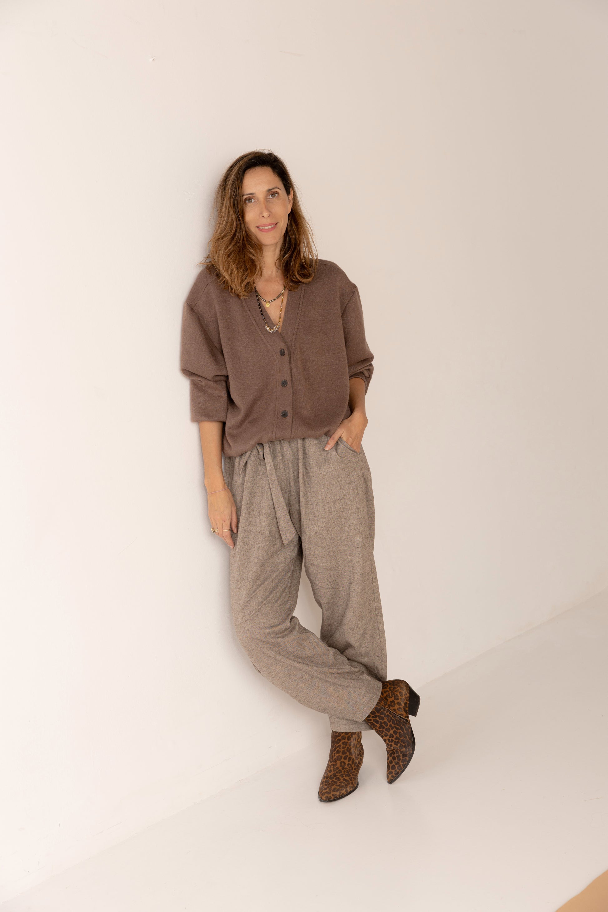 Ligero, relajado, con cintura elástica que abraza sin apretar. El tejido texturizado y el corte amplio invitan al descanso, al paseo lento, al día sin prisa. Se lleva con naturalidad, como quien elige la comodidad sin renunciar a la belleza.