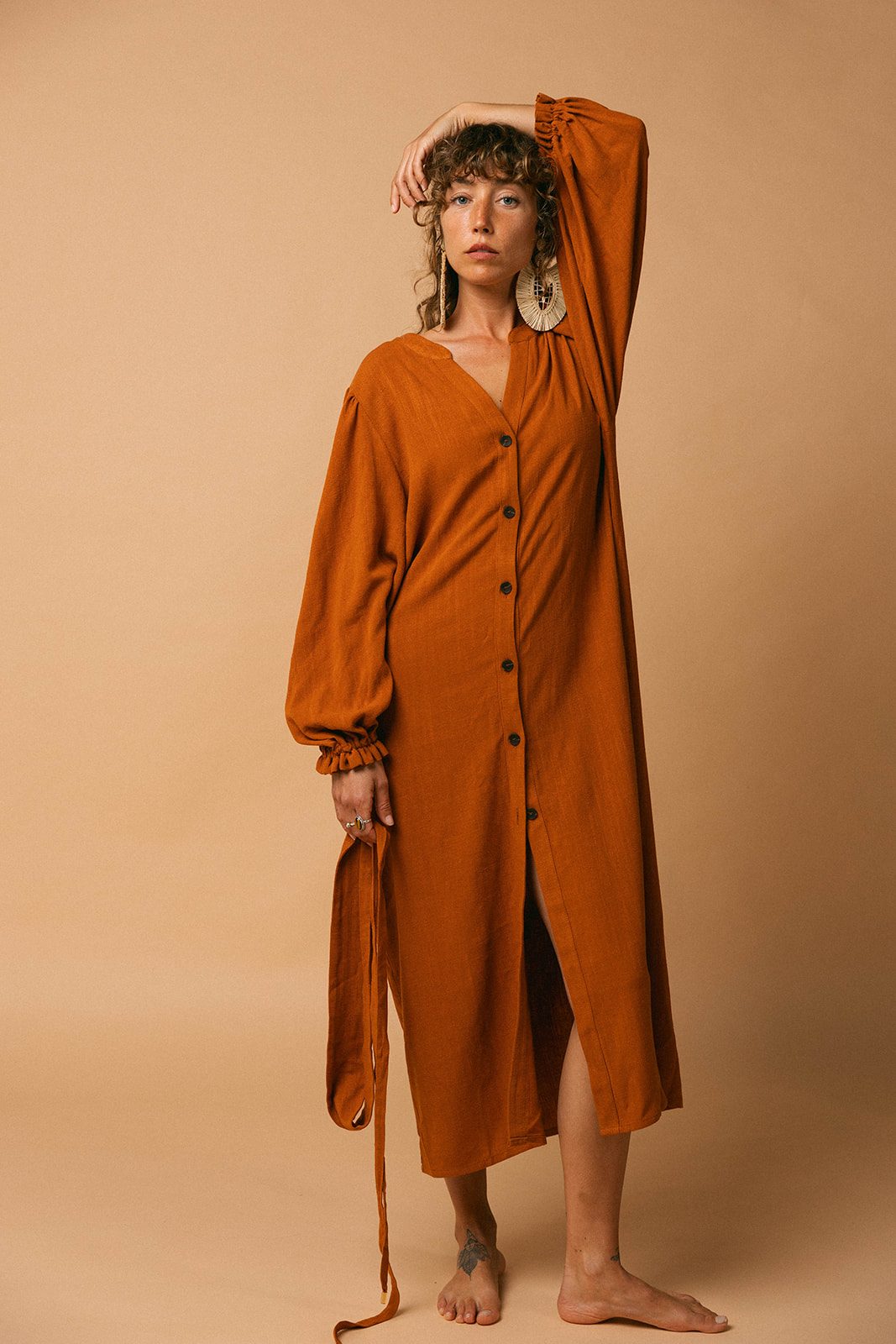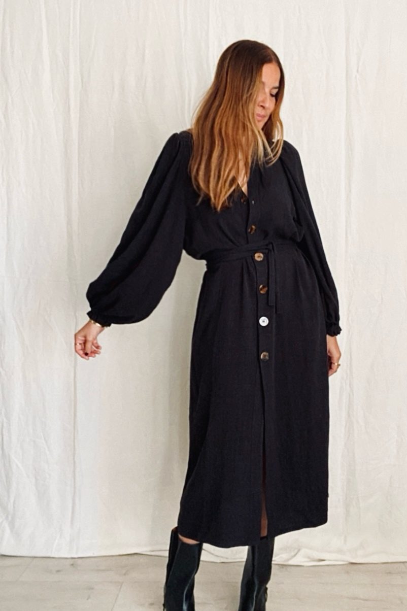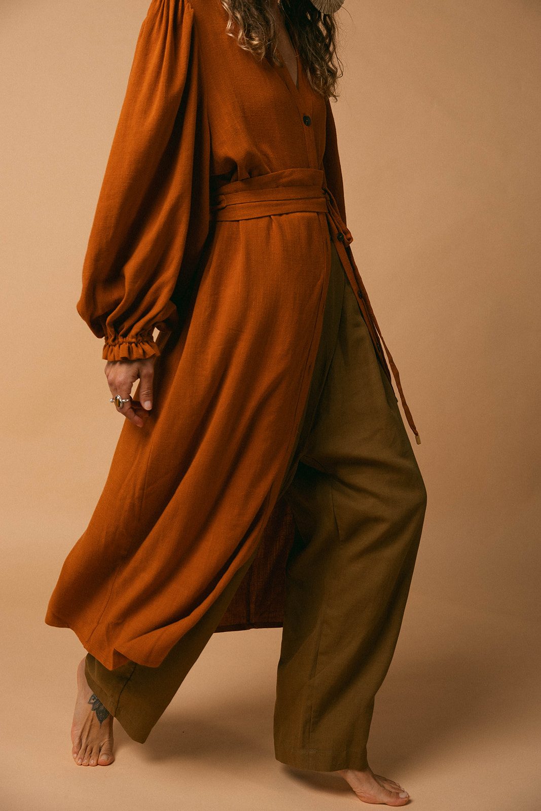 BEA es el perfecto vestido todo terreno, que lo mismo te servirá de túnica sobre un pantalón, de vestido camisero femenino suelto como de prenda especial añadiéndole el fajín que lo acompaña realzando tu figura para dar mucho juego en una ocasión especial. Si lo combinas con los pantalones Lauren lino, conseguirás además un look muy sofisticado, con un toque oriental y elegante. Ya lo sabes, que un Ten Twelve no sólo es calidad sino un sin fin de posibilidades. Este vestido lo encontrarás en dos opciones de color. El favorecedor teja combinado con unos botones de corozo, y el elegante negro combinado con unos botones de fantasía efecto concha. Los increíbles pendientes de estas imágenes son de nuestras amigas Verbena Madrid.