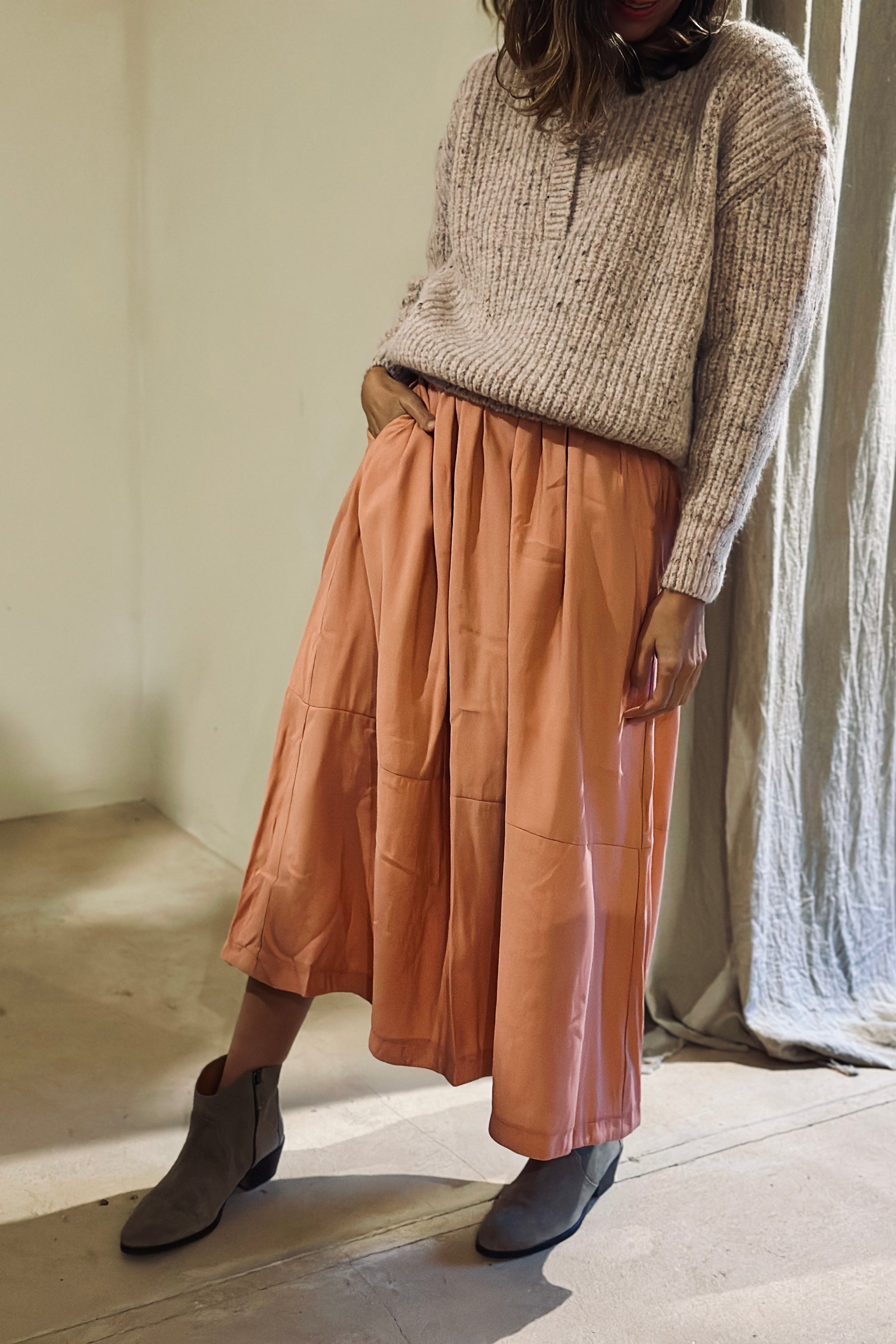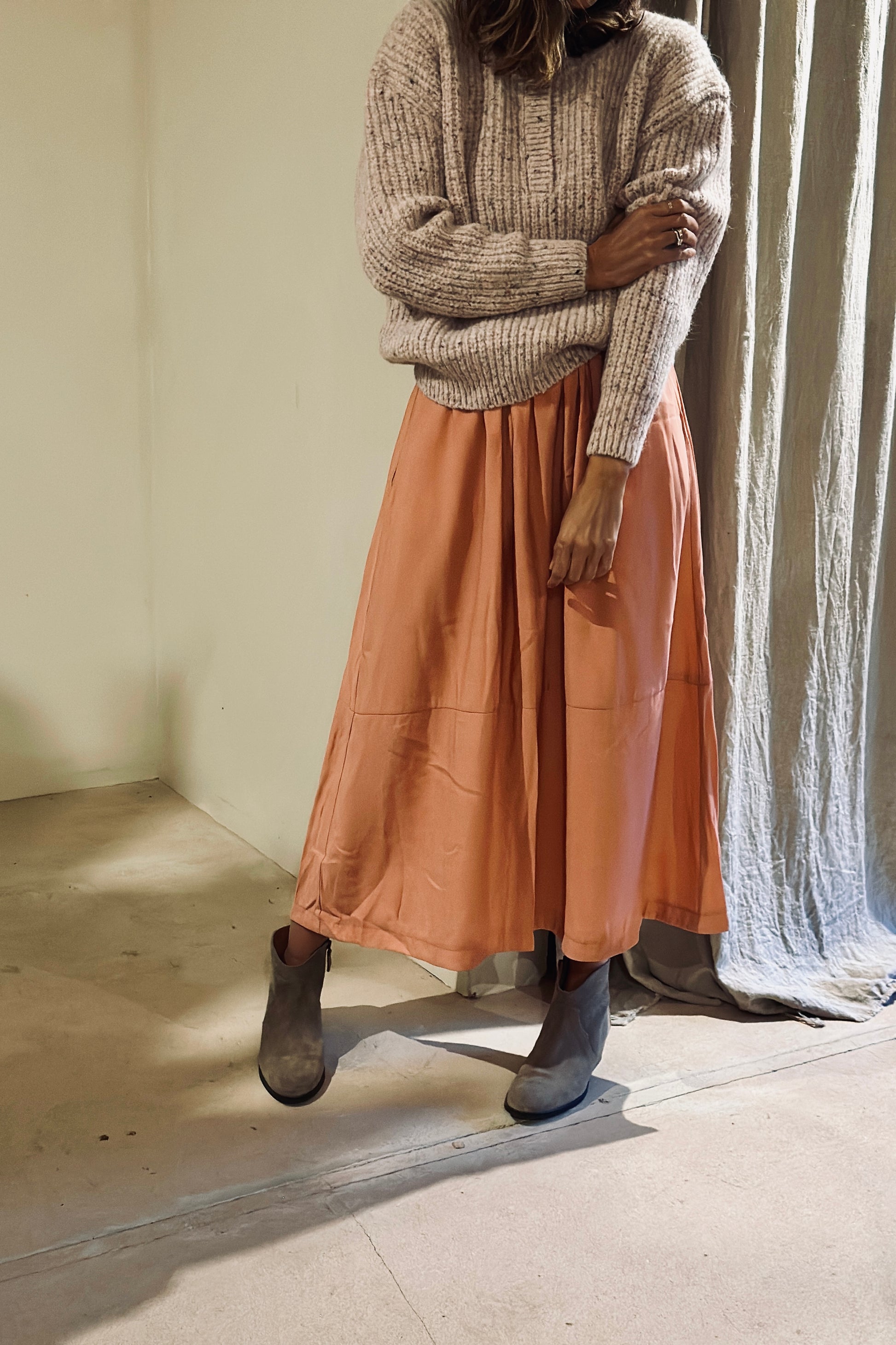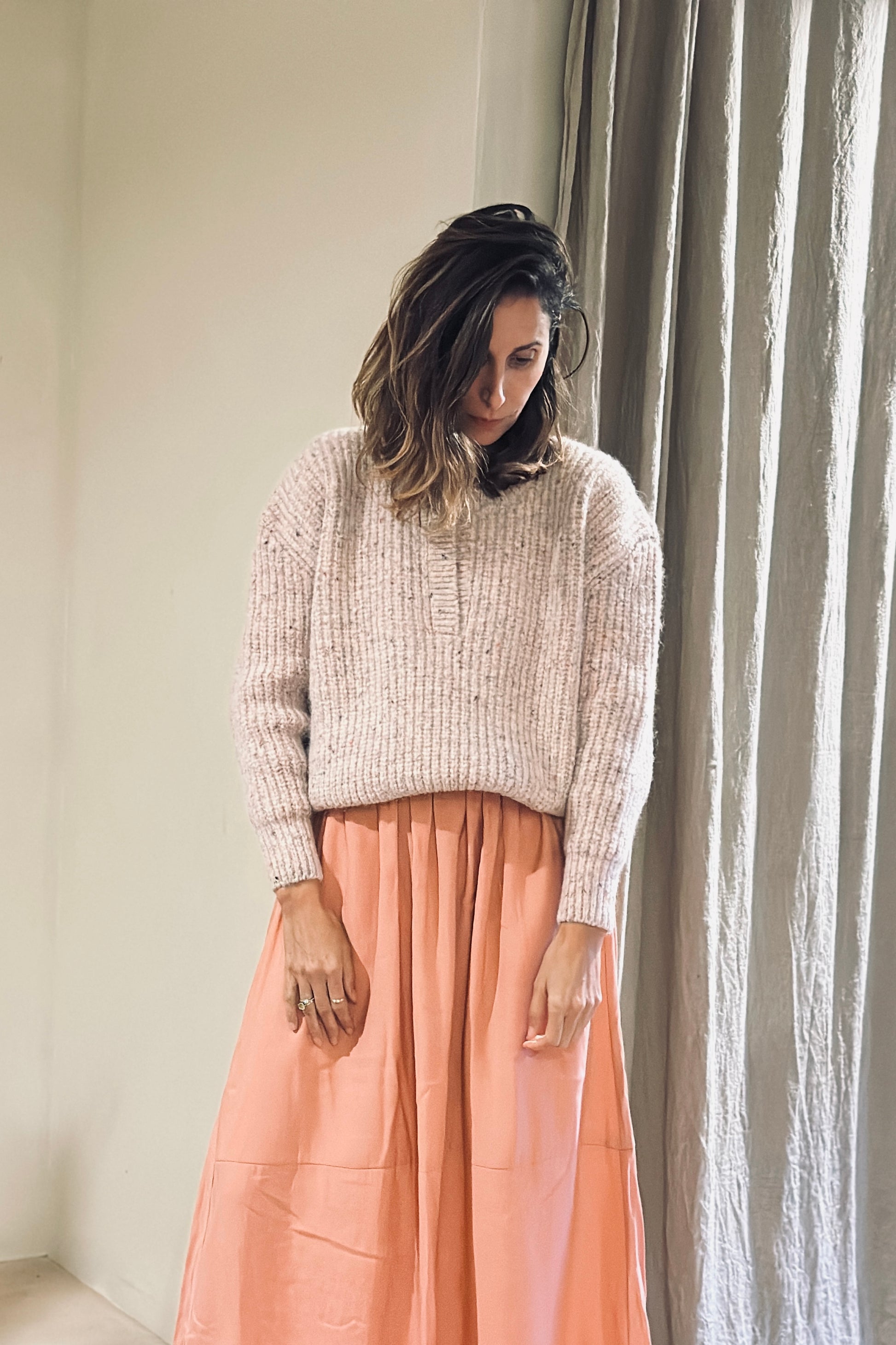La combinación FLORA + COCO es una invitación a vestir belleza serena y comodidad auténtica. El suéter FLORA en color NUDE aporta calidez y armonía con su tejido suave y su aire delicado, mientras que la falda COCO en color ROSA INVIERNO (ligera, fluida y atemporal) envuelve la silueta con una elegancia relajada. Juntos crean un look equilibrado, femenino y versátil.