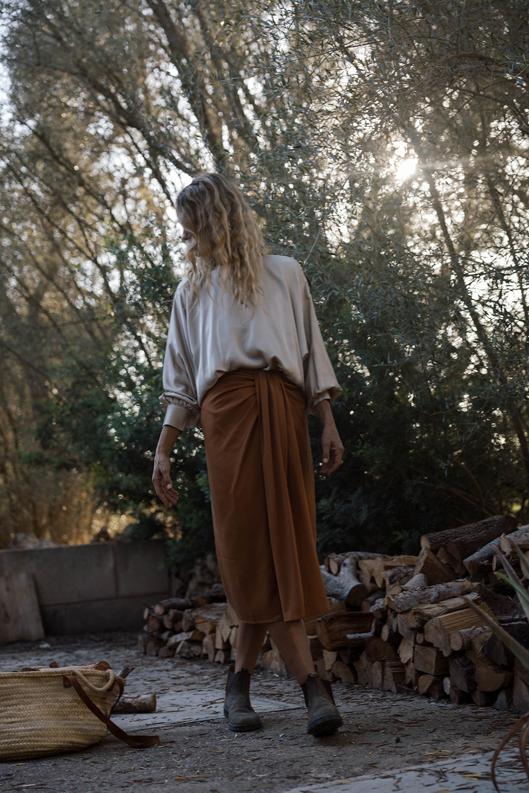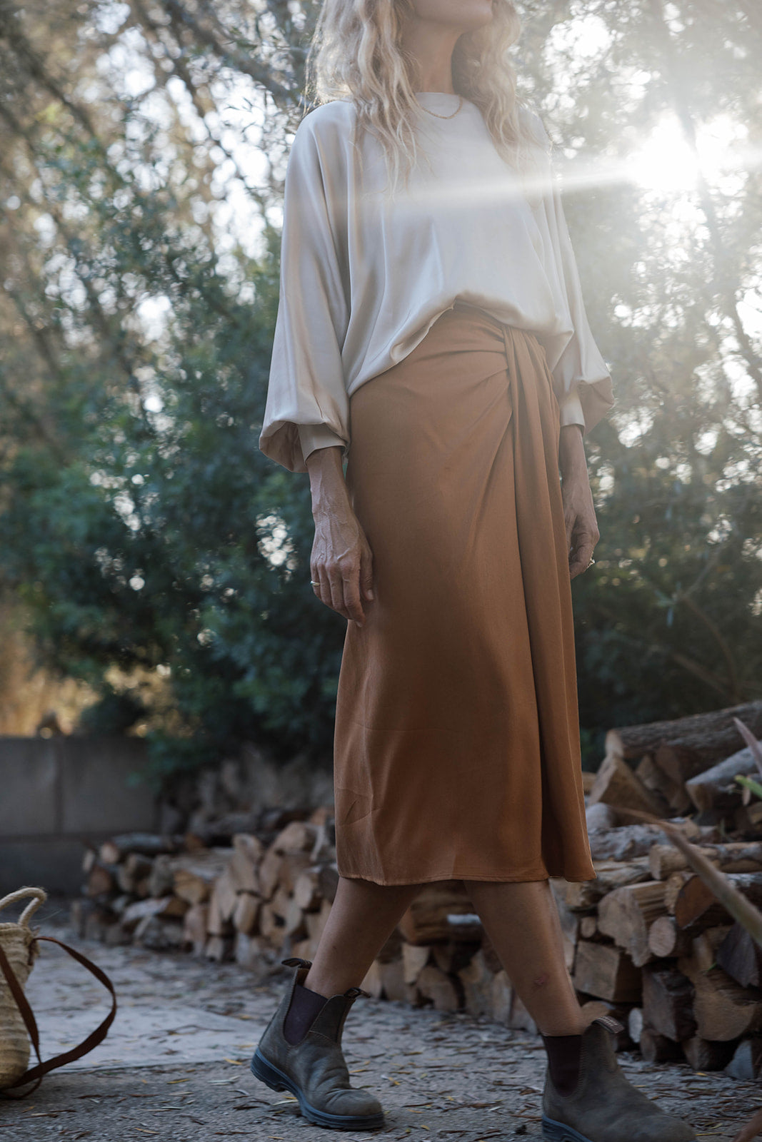 DAVI es una falda de estilo sofisticado con pliegue en el lateral y cremallera invisible en el centro de la espalda. Una pieza única y de estilo urbano.