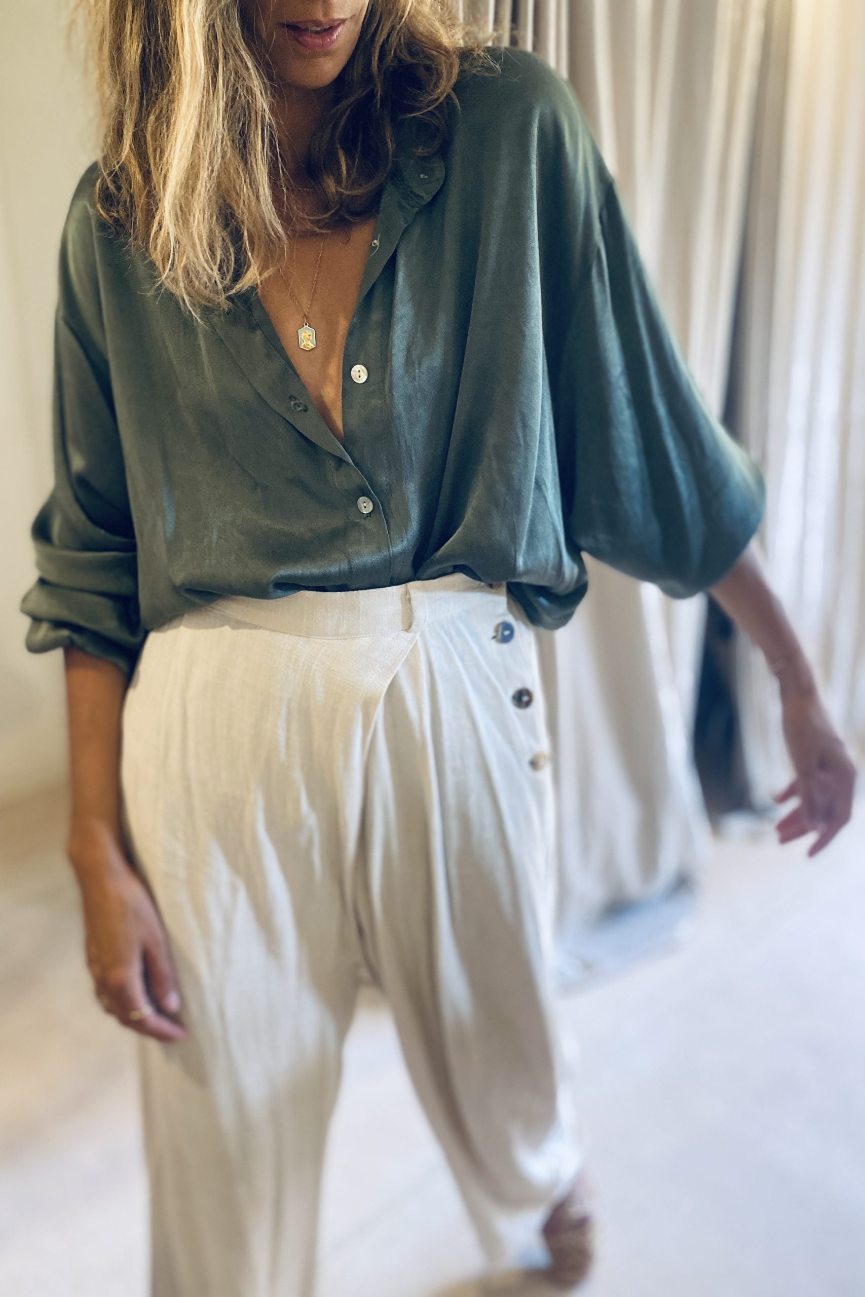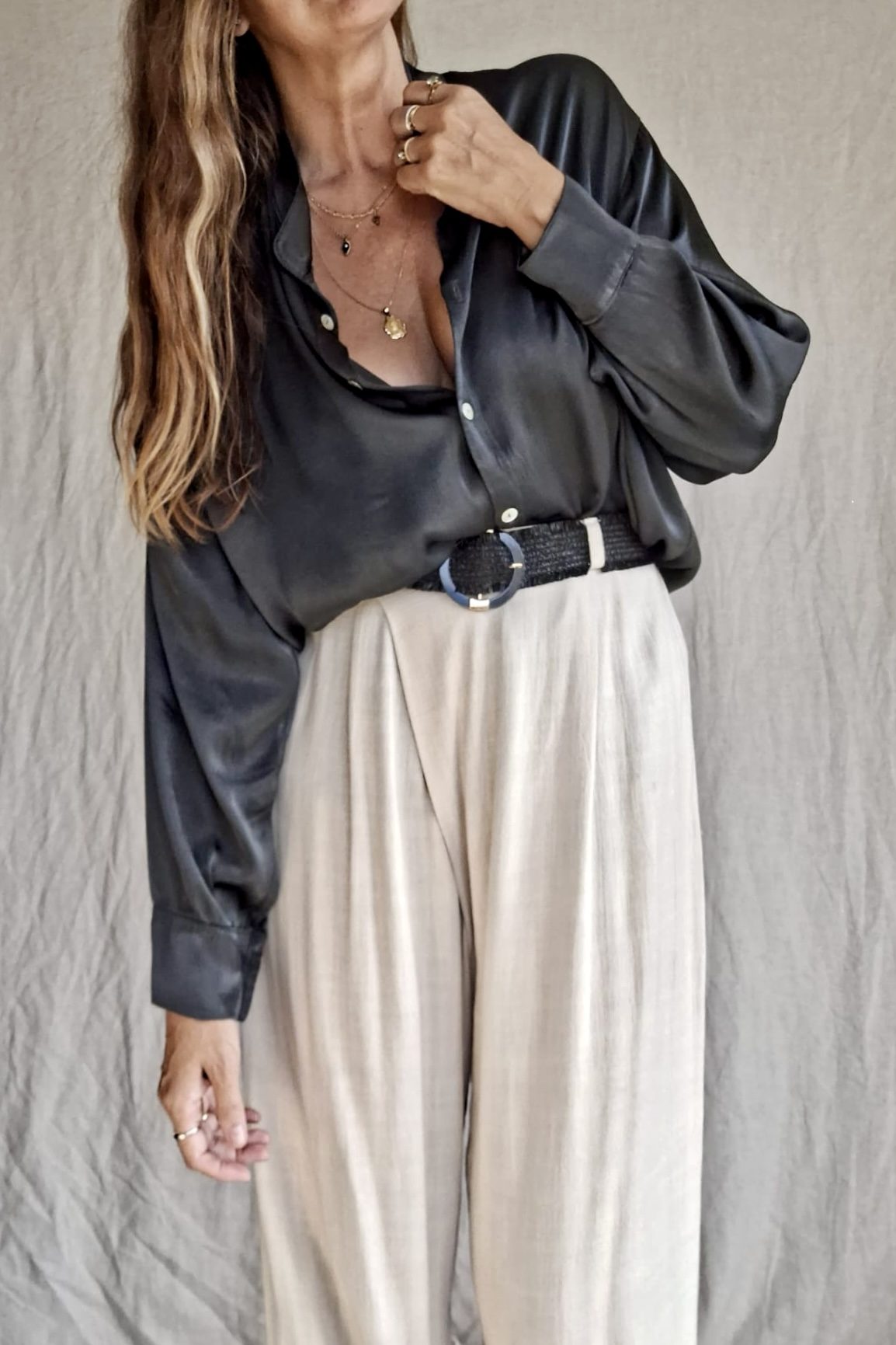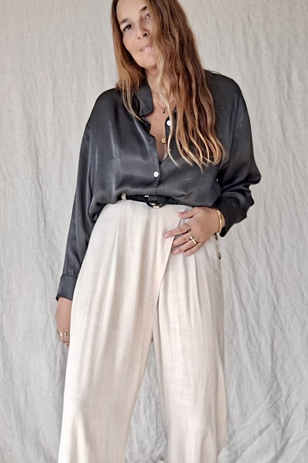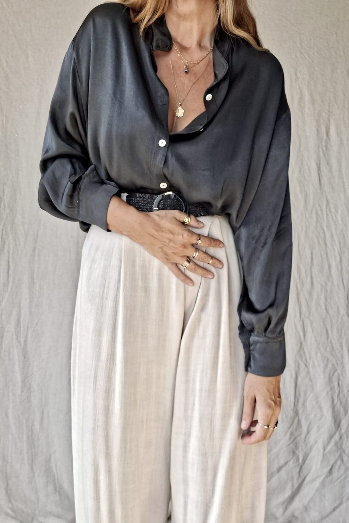DIANA es una bonita camisa satinada confeccionada en viscosa (100%) de estilo masculino con cuello maho. Es perfecta para combinar con el Pantalón YOLANDA para un look diario atemporal y versátil.