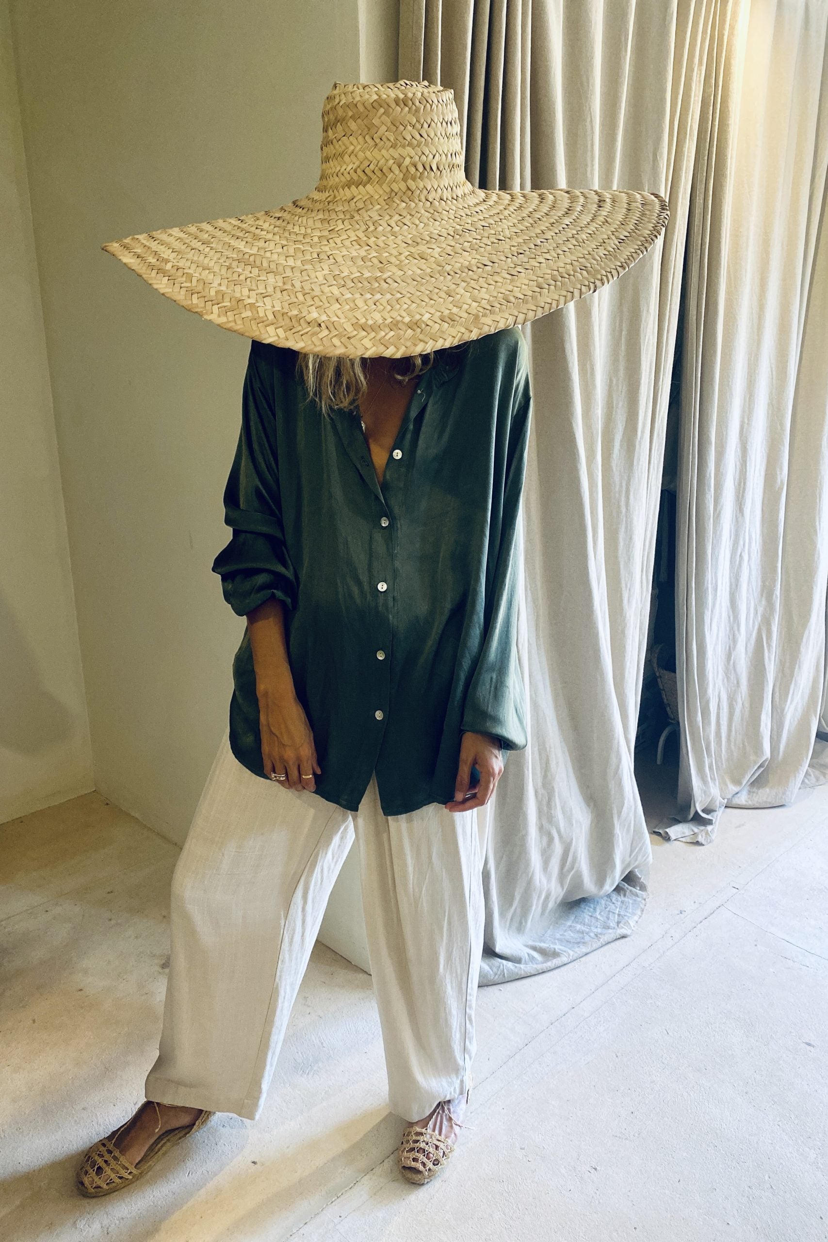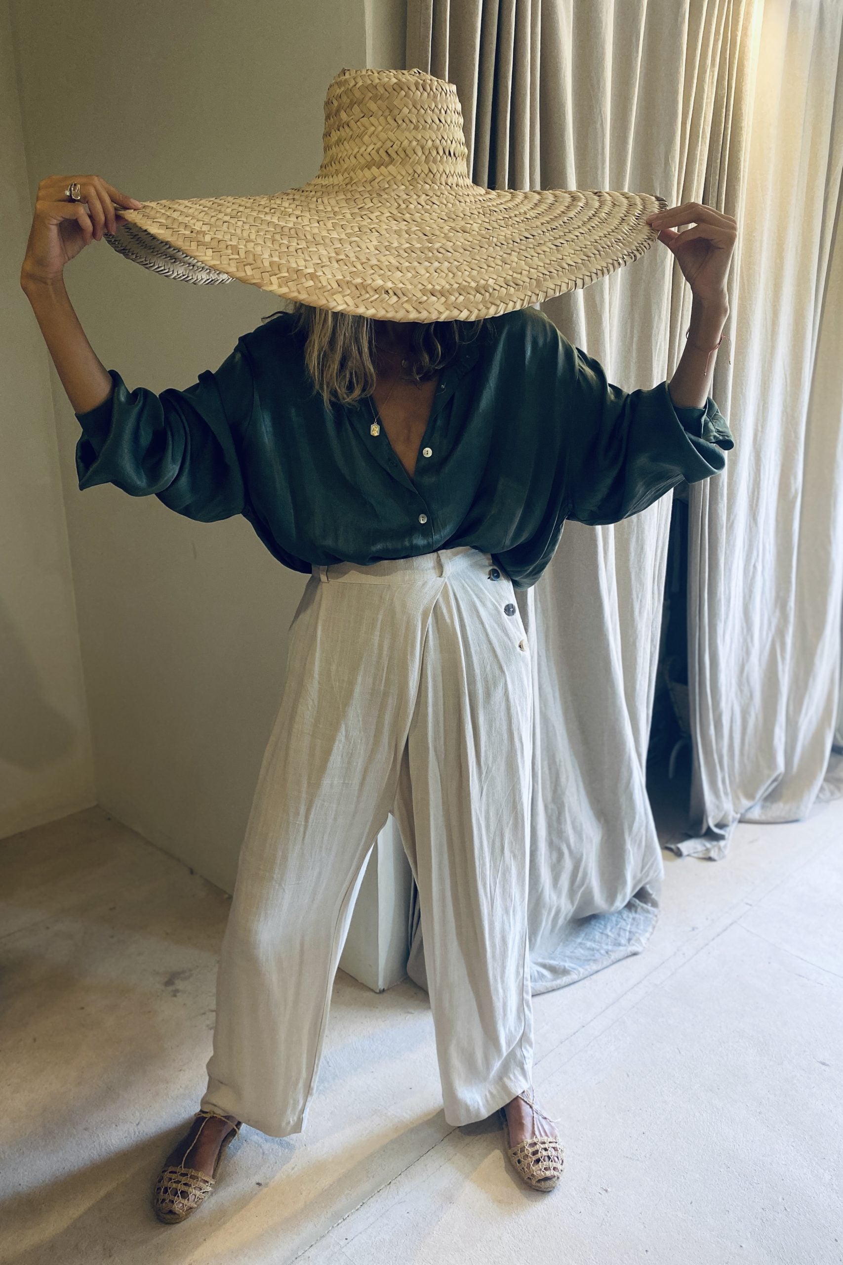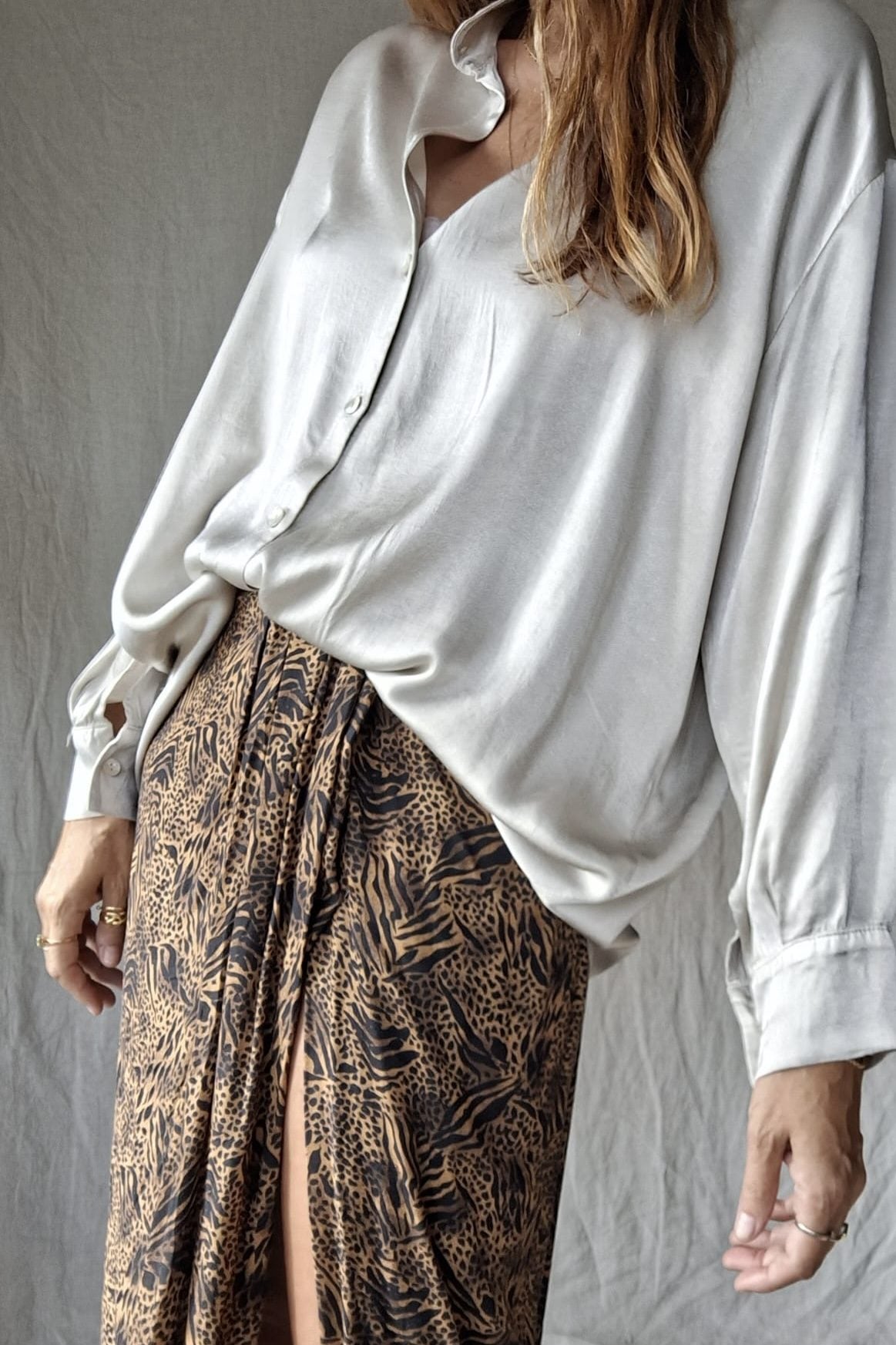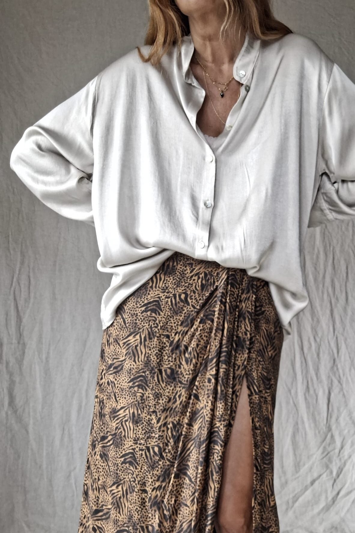 DIANA es una bonita camisa satinada confeccionada en viscosa (100%) de estilo masculino con cuello maho. Es perfecta para combinar con el Pantalón YOLANDA para un look diario atemporal y versátil.