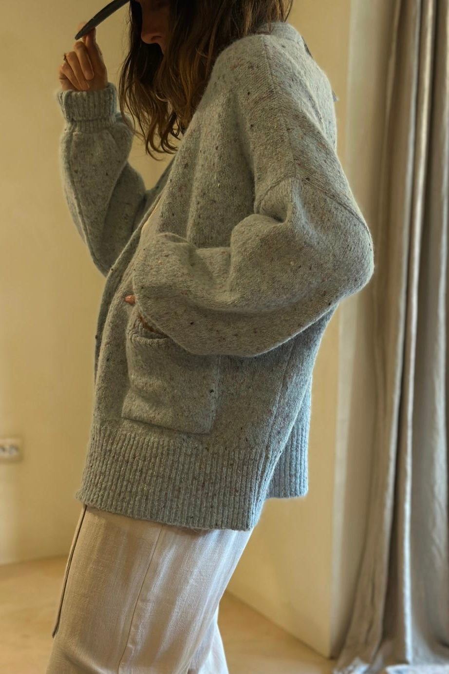 La camisa INÉS, con su delicado ESTAMPADO de RAYAS, aporta un toque de frescura y desenfado, evocando la calma de los días al aire libre. La chaqueta NEW AMALUR, en su tono AZUL claro, envuelve con suavidad y añade ese punto moderno y sofisticado que equilibra el look.
