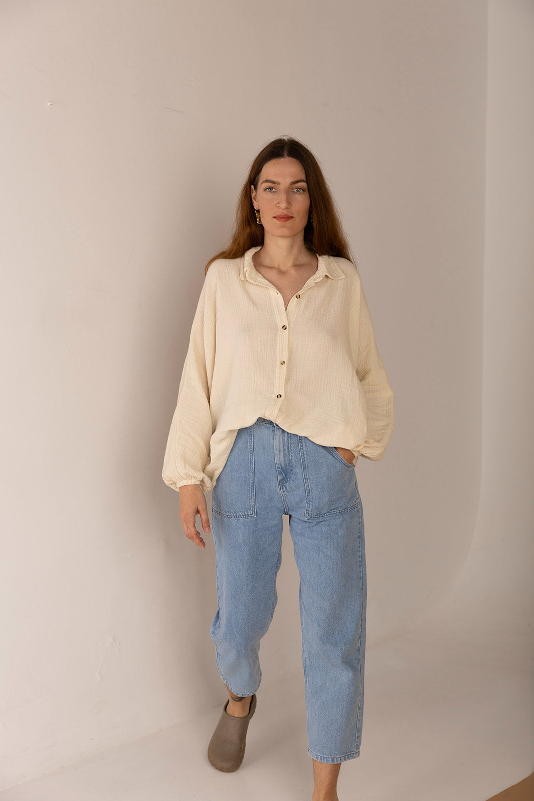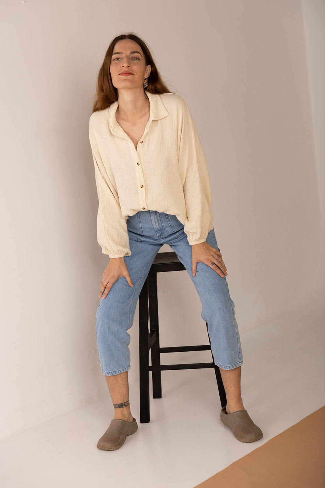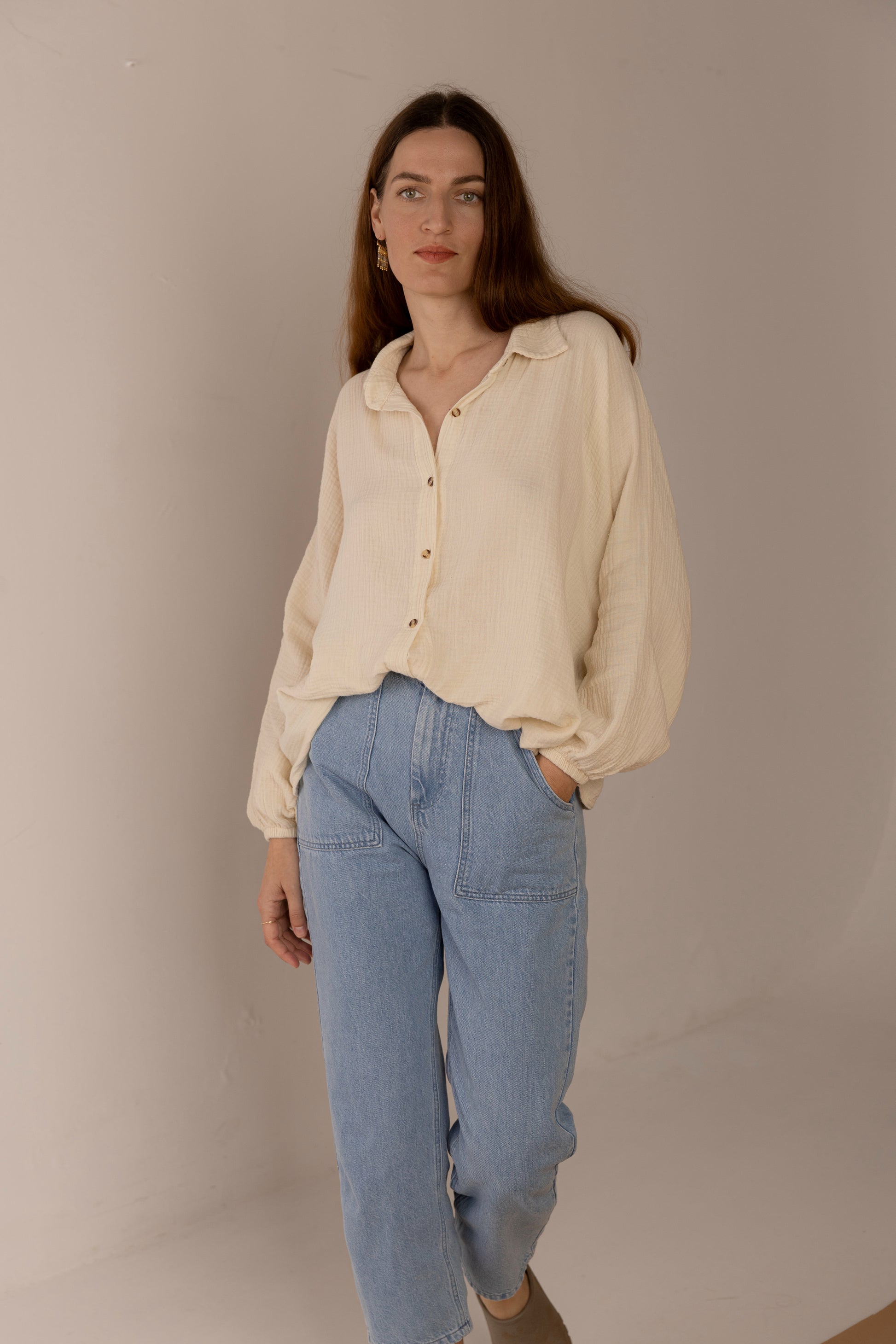 Una blusa que se posa con calma. Amplia, ligera, con caída suave y botones que no apuran. El cuello abierto y las mangas generosas invitan al movimiento lento, al gesto despreocupado. El tono tierra y la textura sutil la convierten en una pieza que acompaña sin exigir, como quien está presente sin hacer ruido.