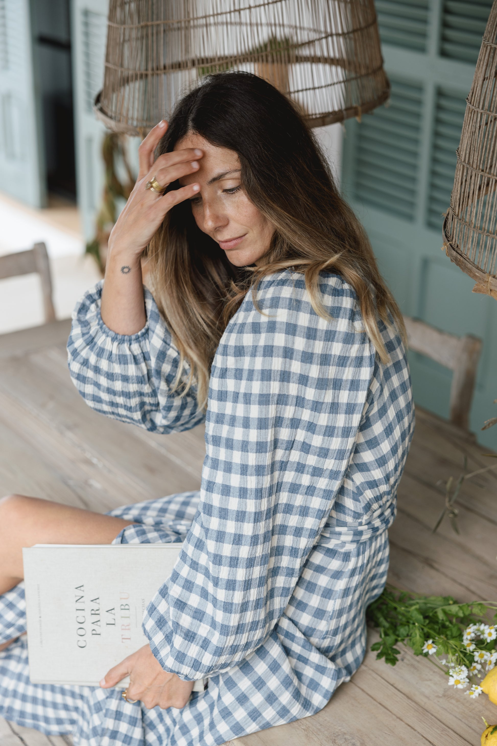 NATALIA es un vestido de estilo romántico y minimalista. Su tejido muselina de algodón lo hace cómodo y agradable a la piel. Su manga abullonada, lazo en la cintura, largo midi y tinte en hilo de cuadros la convierten en una prenda muy femenina.