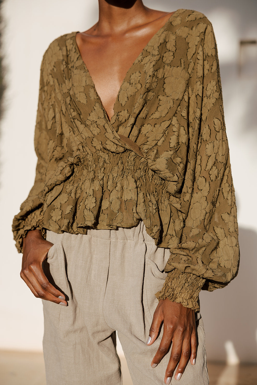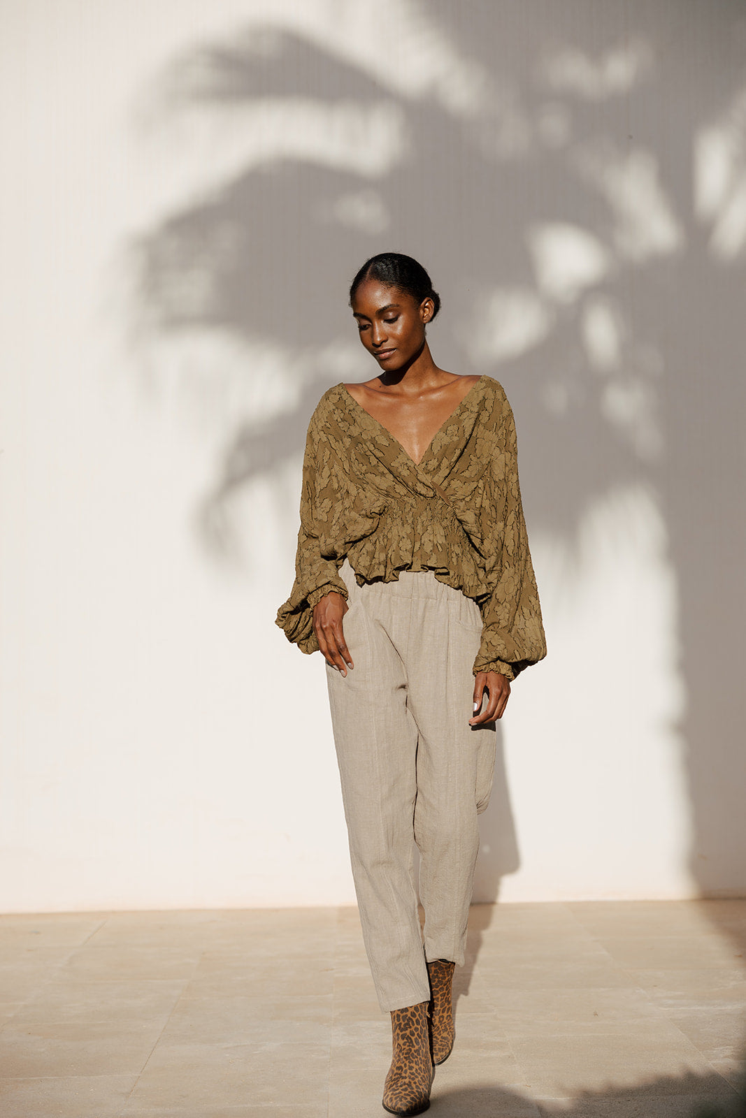 BRANDON es una blusa de estilo romántico, con escote cruzado y cintura elástica que se ajusta con suavidad al cuerpo. Confeccionada en un delicado jacquard de viscosa, es una prenda ligera y versátil.